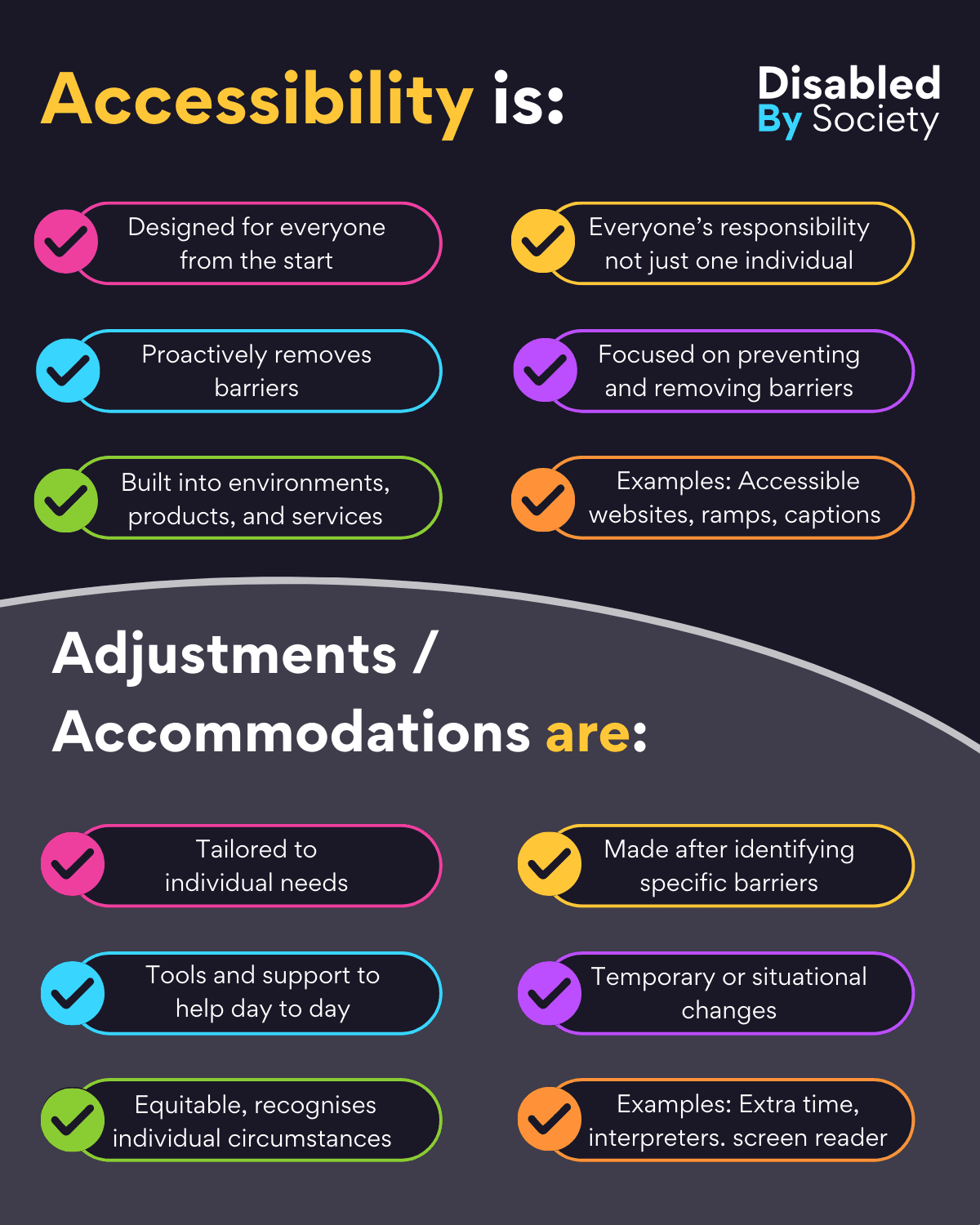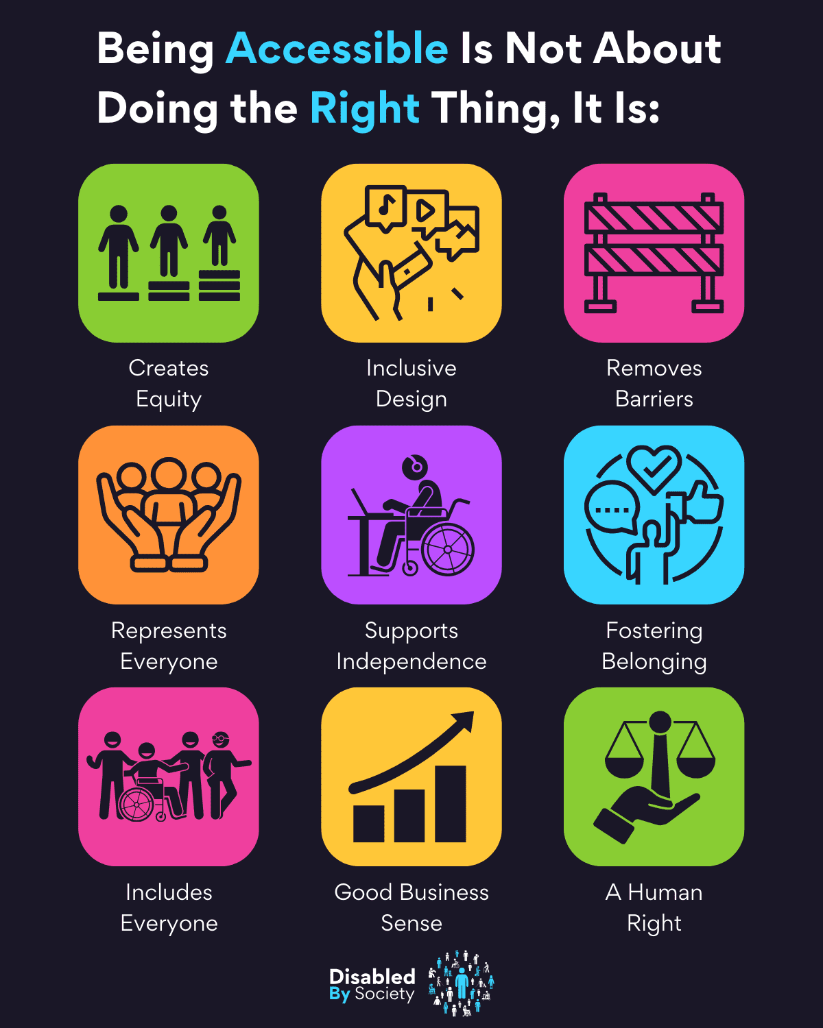 ID: Disabled by Society graphic titled “Being Accessible Is Not About Doing the Right Thing, It Is:”, set on a dark background with nine colourful icons and statements: “Creates Equity” – green icon with three figures on platforms of varying heights; “Inclusive Design” – yellow icon of hand holding media symbols; “Removes Barriers” – pink icon with construction barrier; “Represents Everyone” – orange icon with hands holding people; “Supports Independence” – purple icon of wheelchair user at computer; “Fostering Belonging” – light blue icon with speech bubbles and figures; “Includes Everyone” – pink icon with diverse people; “Good Business Sense” – yellow icon with upward graph; “A Human Right” – green icon with hand holding balanced scales.