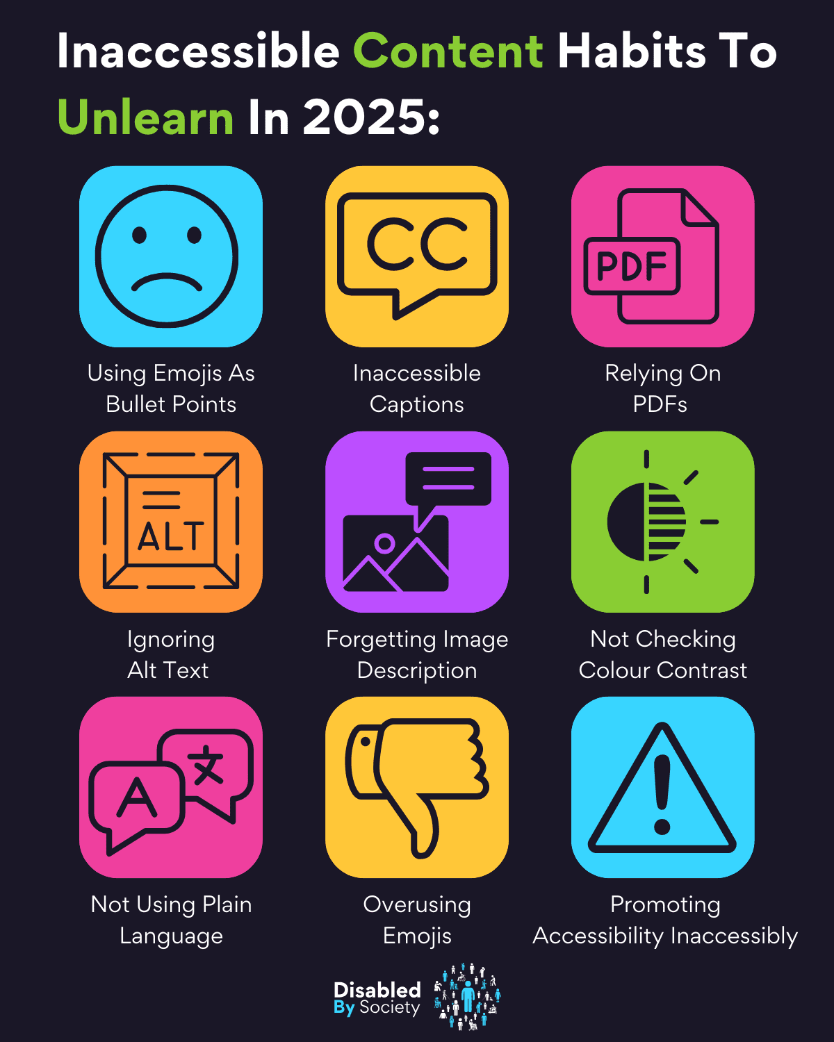 ID: Disabled by Society graphic titled “Inaccessible Content Habits To Unlearn In 2025,” featuring nine colourful icons and statements: “Using Emojis As Bullet Points” – sad face emoji; “Inaccessible Captions” – two Cs in speech bubble; “Relying On PDFs” – PDF icon; “Ignoring Alt Text” – square with ‘Alt’; “Forgetting Image Description” – image with text; “Not Checking Colour Contrast” – half solid, half patterned circle; “Not Using Plain Language” – two speech bubbles; “Overusing Emojis” – thumbs down icon; “Promoting Accessibility Inaccessibly” – caution exclamation mark.