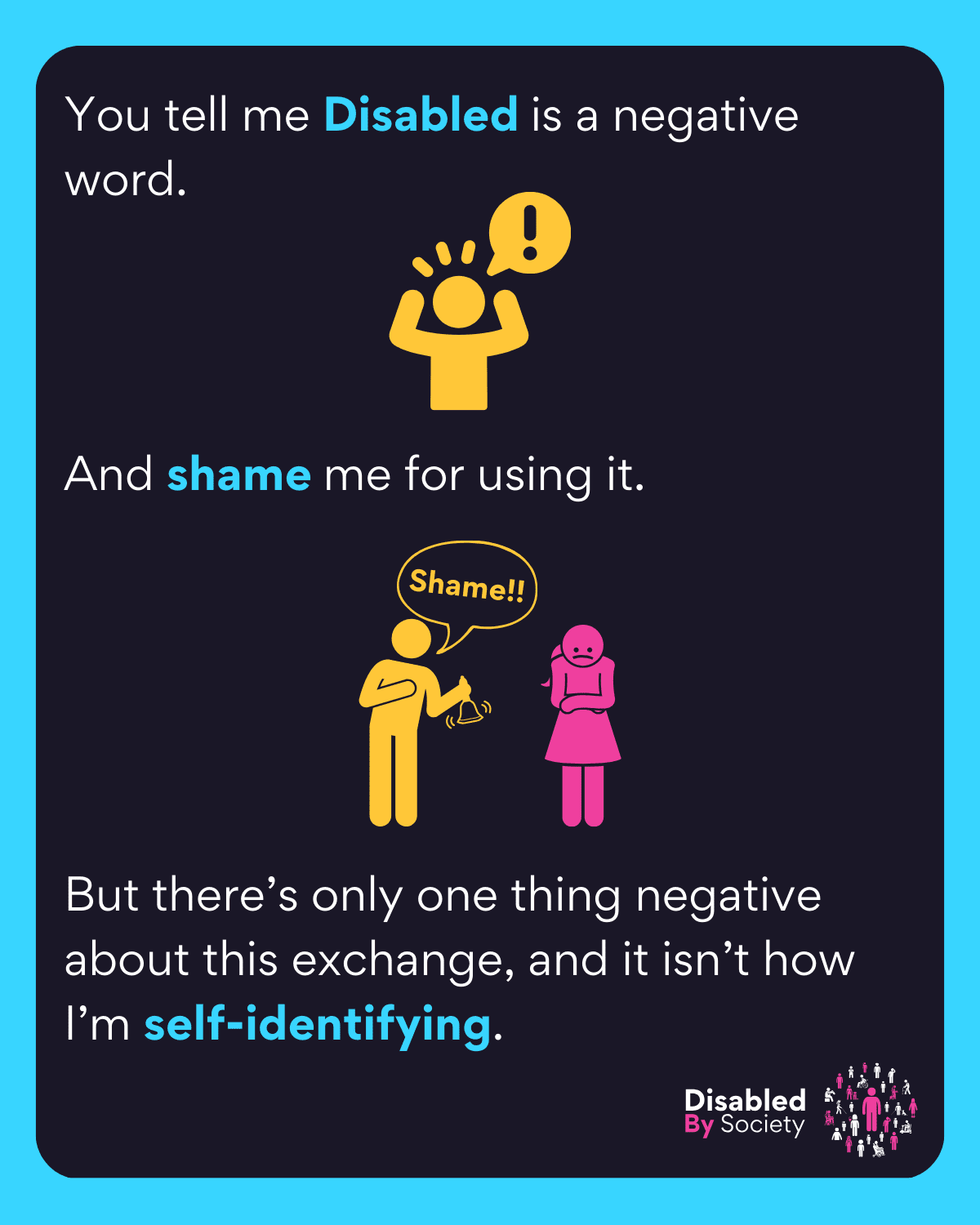 ID: A Disabled by Society graphic with the text, “You tell me Disabled is a negative word,” showing a person with hands raised in frustration. Below, clipart of a stick figure ringing a bell labelled “shame” at another upset figure, referencing “Game of Thrones” style shame. The text concludes, “But there’s only one thing negative about this exchange, and it isn’t how I’m self-identifying.”