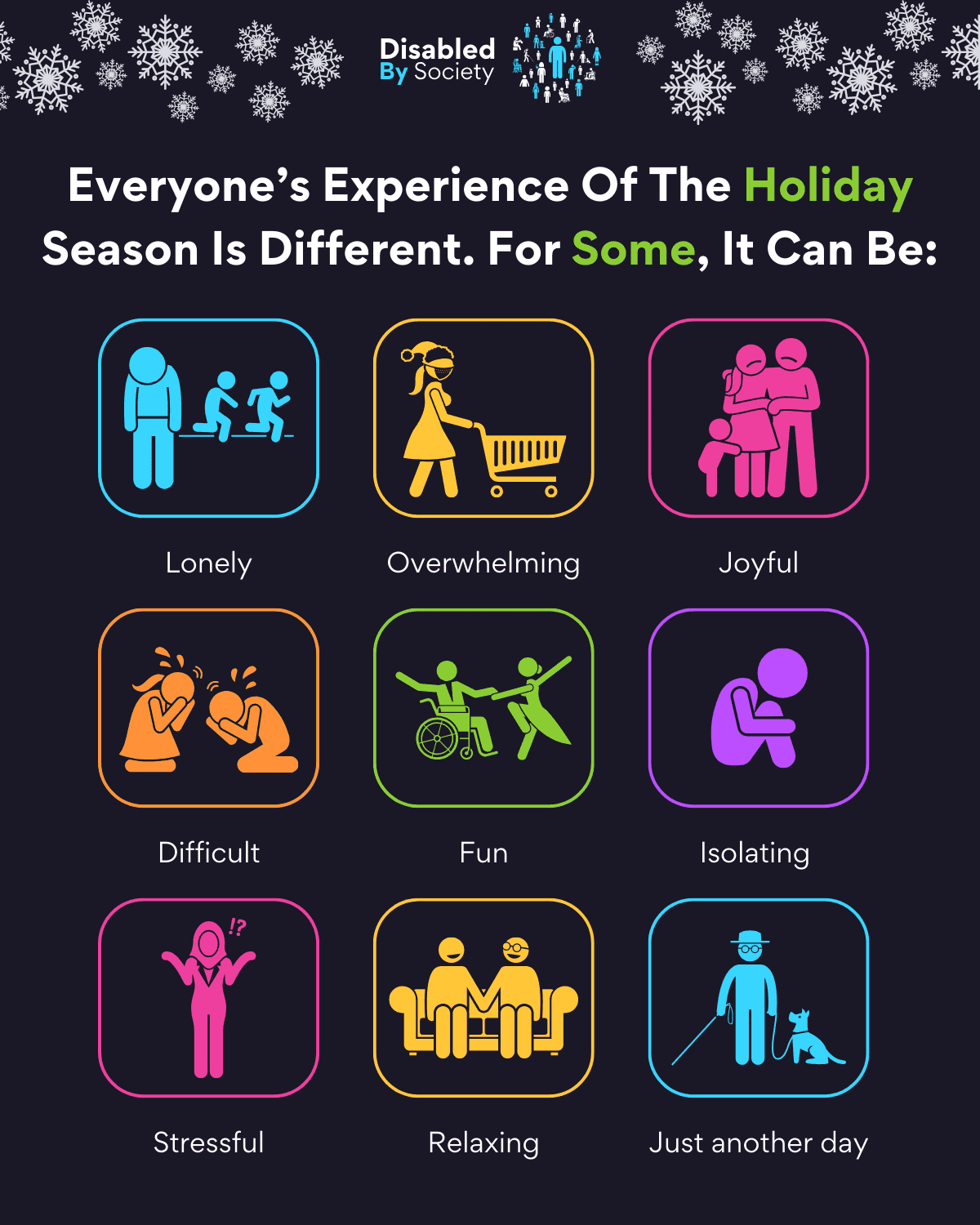 ID: A Disabled by Society graphic set on a dark purplish background with snowflakes along the top and the Disabled by Society logo centred. The title reads, “Everyone’s Experience Of The Holiday Season Is Different. For Some, It Can Be:” Below are nine colourful squares each containing stick-figure clipart and a word describing experiences: 1. Lonely – a sad person while others run behind; 2. Overwhelming – person shopping with Christmas hat and face mask; 3. Joyful – mum, dad and child spending time together; 4. Difficult – two people crying; 5. Fun – two people dancing, one in a wheelchair; 6. Isolating – person hugging knees; 7. Stressful – person shrugging confused; 8. Relaxing – same-sex couple on sofa; 9. Just another day – blind person with guide dog and cane.