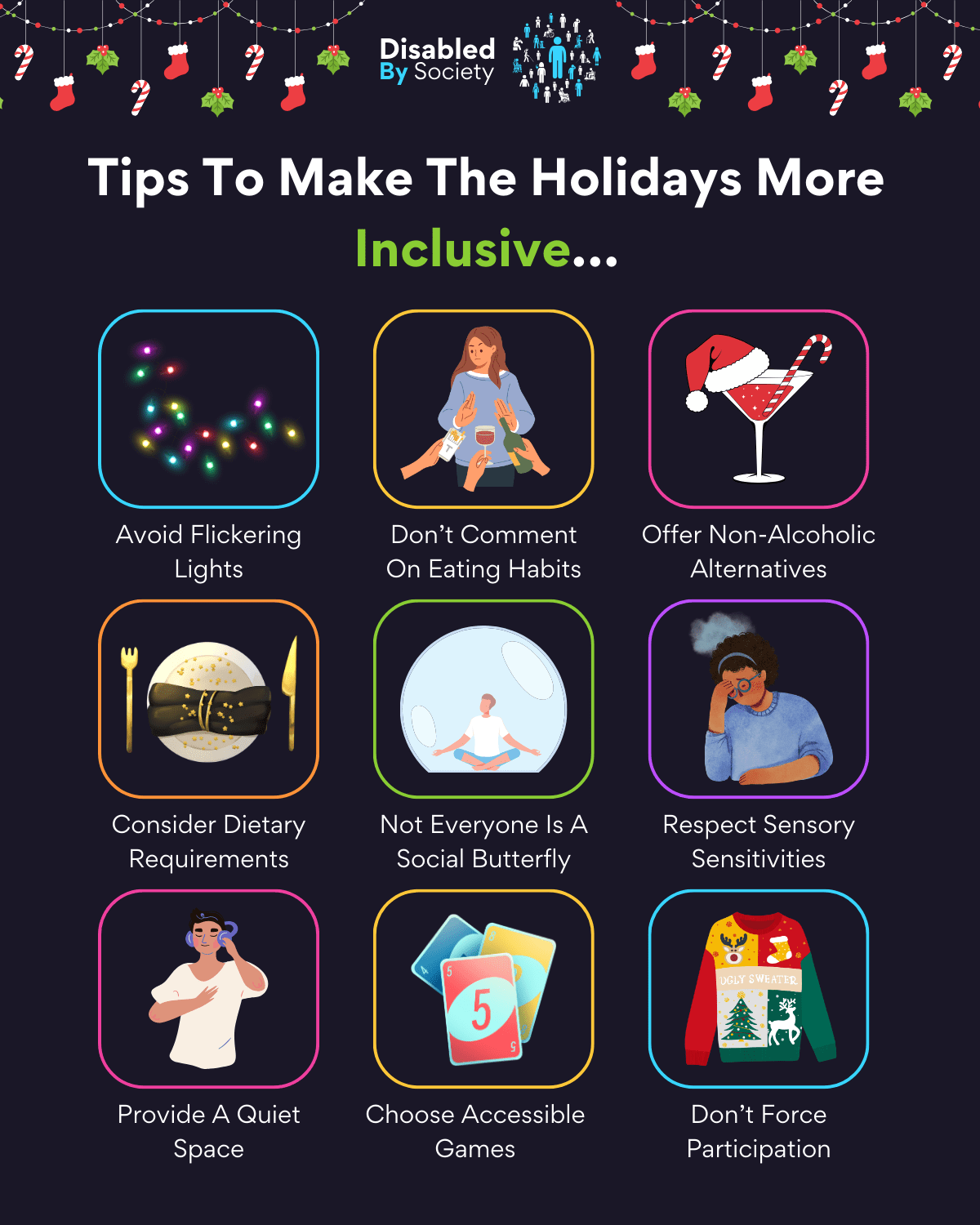 ID: A Disabled by Society graphic set on a dark purplish background with a festive border of Christmas stockings, candy canes, and holly hanging from the top. The title reads, “Tips To Make The Holidays More Inclusive…” Below are nine colourful curved squares, each containing a statement and clipart: Avoid Flickering Lights; Don’t Comment On Eating Habits; Offer Non-Alcoholic Alternatives; Consider Dietary Requirements; Not Everyone Is A Social Butterfly; Respect Sensory Sensitivities; Provide A Quiet Space; Choose Accessible Games; Don’t Force Participation.