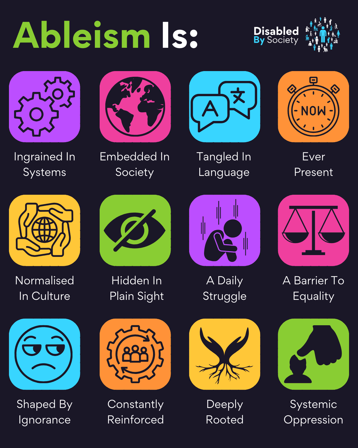 ID: A Disabled by Society graphic titled “Ableism Is” is set against a dark background, making its twelve vibrant, colourful icons stand out boldly. Each icon represents a different facet of ableism, using distinct colours and simple symbols to convey layered meanings. The statements read: Ingrained In Systems – a purple icon with interlocking gears; Embedded In Society – a pink icon featuring a globe; Tangled In Language – a blue icon with speech bubbles and translation marks; Ever Present – an orange icon showing a stopwatch; Normalised In Culture – a yellow icon with hands cradling a globe; Hidden In Plain Sight – a green icon with an eye crossed out; A Daily Struggle – a purple icon showing a figure sitting with their knees drawn in; A Barrier To Equality – a pink icon with balanced justice scales; Shaped By Ignorance – a blue icon with a skeptical face; Constantly Reinforced – an orange icon featuring a gear surrounded by people; Deeply Rooted – a yellow icon with visible tree roots; and Systemic Oppression – a green icon of a hand holding a chess pawn. Together, they present a stark visual message about the pervasive, complex, and systemic nature of ableism.