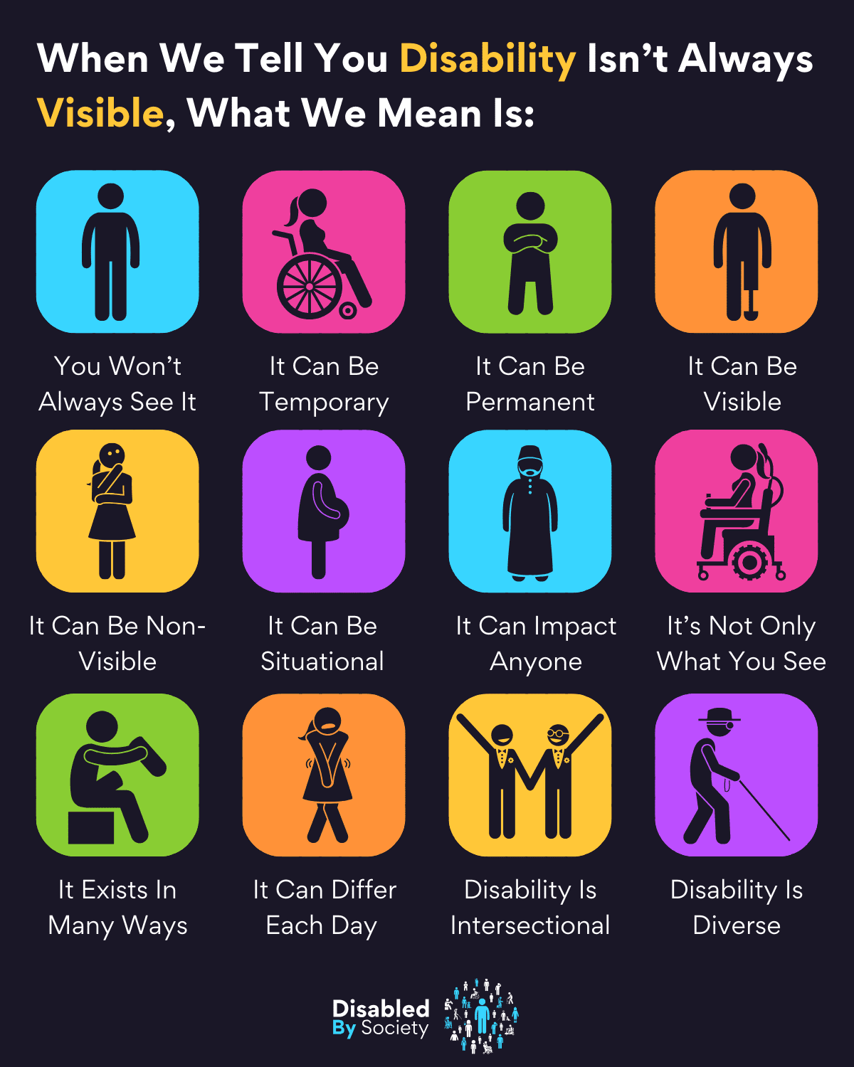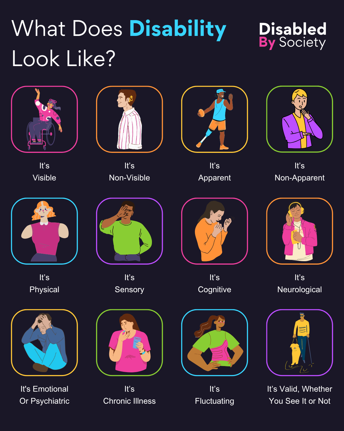 ID: A Disabled by Society graphic titled “What Does Disability Look Like?” Below 12 illustrated examples of different types of disabilities in colourful boxes. The categories are: It’s Visible – a person in a wheelchair with. It’s Non-Visible – a person with no visible Disability. It’s Apparent – person with a prosthetic leg. It’s Non-Apparent – person side on with a hearing aid. It’s Physical – person with upper limb difference. It’s Sensory – person covering their eyes. It’s Cognitive – person focusing to concentrate. It’s Neurological – person wearing noise cancelling headphones. It’s Emotional or Psychiatric – person sitting on the ground with head in hands. It’s Chronic Illness – person taking medication. It’s Fluctuating – person wearing a brace. It’s Valid, Whether You See It or Not – blind person walking with a guide dog.