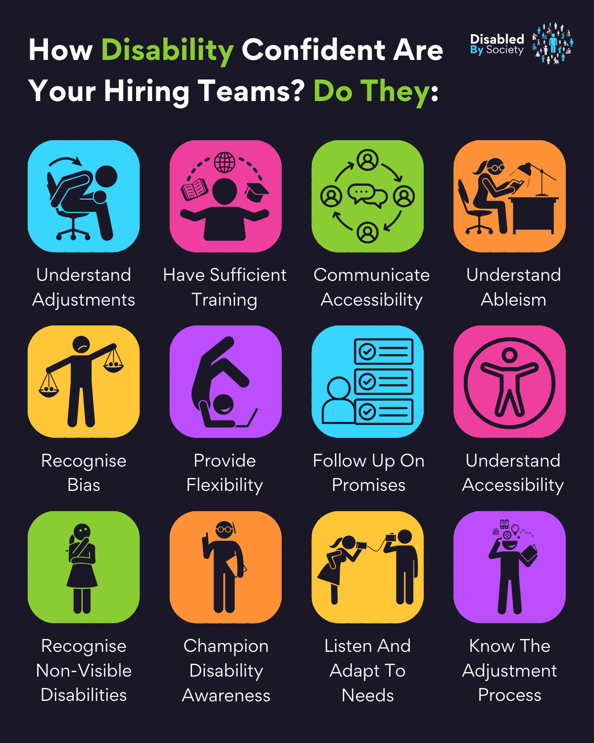 ID: A Disabled by Society graphic titled “How Disability Confident Are Your Hiring Teams? Do They:” set against a dark background with twelve colourful square icons arranged in a grid. Each icon features a distinct background colour with a black silhouette illustrating one of twelve aspects of disability-inclusive hiring practices. The statements read: 1. “Understand Adjustments” – showing a person assisting another with workplace tools. 2. “Have Sufficient Training” – depicting a person presenting to a group. 3. “Communicate Accessibility” – a figure speaking with an accessibility symbol beside them. 4. “Understand Ableism” – a person breaking free from a tangled web. 5. “Recognise Bias” – showing two people, one treated differently from the other. 6. “Provide Flexibility” – a person multitasking with work and personal items. 7. “Follow Up On Promises” – a figure ticking a checklist. 8. “Understand Accessibility” – a person navigating a ramp. 9. “Recognise Non-Visible Disabilities” – a person standing with symbols representing mental health. 10. “Champion Disability Awareness” – a person holding a megaphone with a disability symbol. 11. “Listen And Adapt To Needs” – two figures in conversation, one noting down ideas. 12. “Know The Adjustment Process” – a gear icon held by two people in collaboration. The consistent use of UK English, vibrant design, and inclusion-forward messaging underline the importance of confident, informed, and accessible hiring practices.