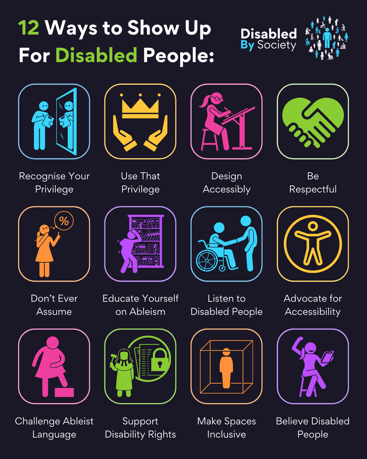 ID: A Disabled by Society graphic titled “12 Ways to Show Up for Disabled People” set against a dark background, featuring twelve colourful square icons with stylised stick-figure illustrations. The icons represent ways to support Disabled people: 1) Blue icon showing a person looking at their reflection in a mirror symbolising self-awareness with the text “Recognise Your Privilege.” 2) Yellow icon with two hands holding a crown representing leveraging privilege with “Use That Privilege.” 3) Pink icon depicting a person in glasses working at a drafting table promoting accessible design labelled “Design Accessibly.” 4) Green icon featuring a handshake symbolising respect and allyship with “Be Respectful.” 5) Orange icon showing a person gesturing with a percentage symbol overhead representing harmful assumptions with “Don’t Ever Assume.” 6) Purple icon of a person struggling to reach a book on a high shelf illustrating the effort to self-educate with “Educate Yourself on Ableism.” 7) Light blue icon of a person in a wheelchair being assisted by another symbolising active listening with “Listen to Disabled People.” 8) Yellow icon showing a figure with open arms representing advocacy labelled “Advocate for Accessibility.” 9) Pink icon of a person stepping forward confidently symbolising challenging harmful language with “Challenge Ableist Language.” 10) Green icon featuring a person holding a legal document and gavel advocating for rights with “Support Disability Rights.” 11) Orange icon showing a person inside a transparent box representing accessible spaces labelled “Make Spaces Inclusive.” 12) Purple icon of a person raising their hand and reading a book reinforcing trust with “Believe Disabled People.”