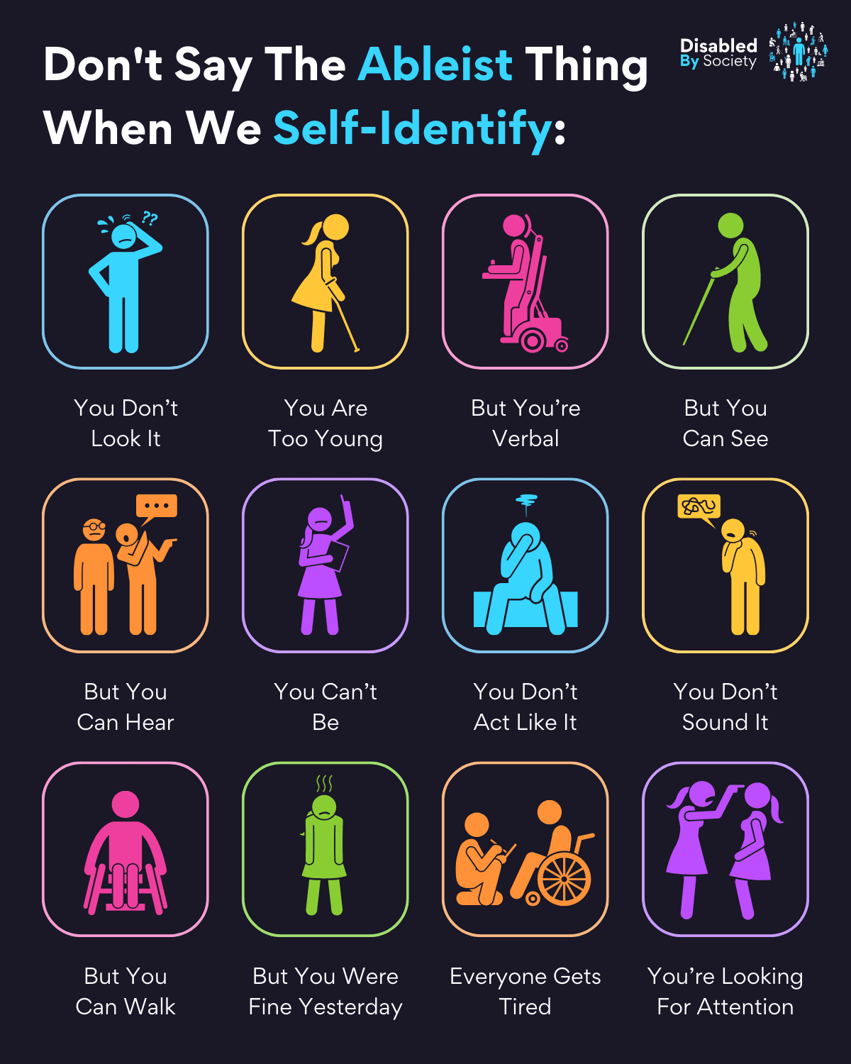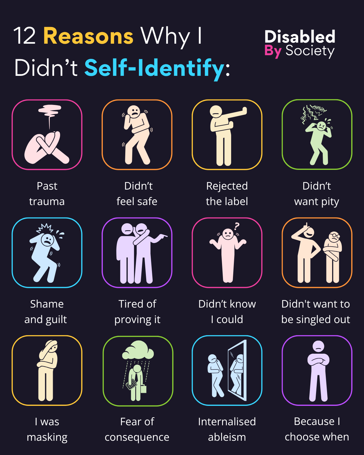 ID: A Disabled by Society graphic titled “12 Reasons Why I Didn’t Self-Identify. Set on a dark background. Below the title are 12 colourful icons with simple stick people illustrations and text beneath each one, listing reasons why someone may not have identified as Disabled: I used the stick person to represent me, but I’m for sure no stick person. Past trauma. Didn’t feel safe. Rejected the label. Didn’t want pity. Shame and guilt. Tired of proving it. Didn’t know I could. Didn’t want to be singled out. I was masking. Fear of consequence. Internalised ableism. Because I choose when. Each icon uses a different colour outline and represents the theme visually.
