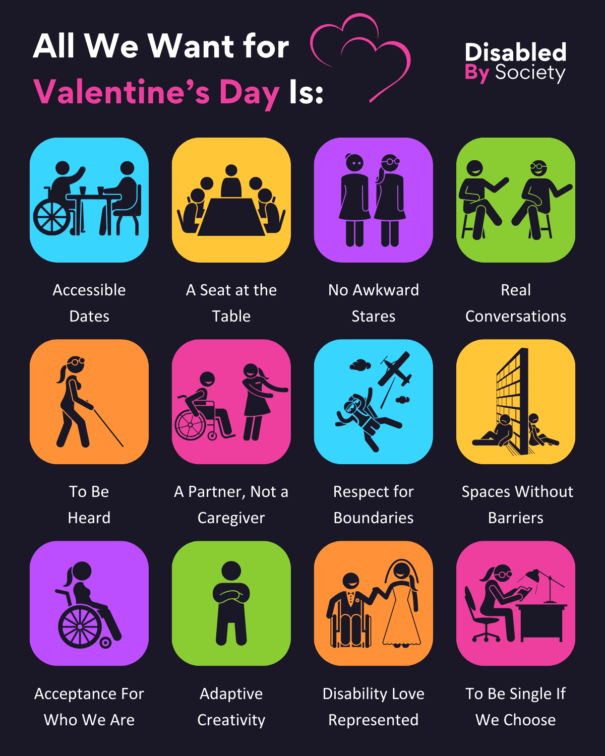 ID: A Disabled by Society graphic titled “All We Want for Valentine’s Day Is,” featuring two love hearts by the title and the Disabled by Society logo at the top right. Below are 12 colourful boxes with clipart and statements: Accessible Dates (two people at a table, one in a wheelchair), A Seat at the Table (people sitting around a table), No Awkward Stares (two figures standing, staring), Real Conversations (two people conversing), To Be Heard (person with a white cane), A Partner, Not a Caregiver (couple dancing, one in a wheelchair), Respect for Boundaries (one person stepping away), Spaces Without Barriers (wheelchair user beside stairs and elevator), Acceptance for Who We Are (confident person in wheelchair), Adaptive Creativity (person standing strong with arms crossed), Disability Love Represented (couple dressed for a wedding, one in wheelchair), To Be Single If We Choose (person alone at desk writing).