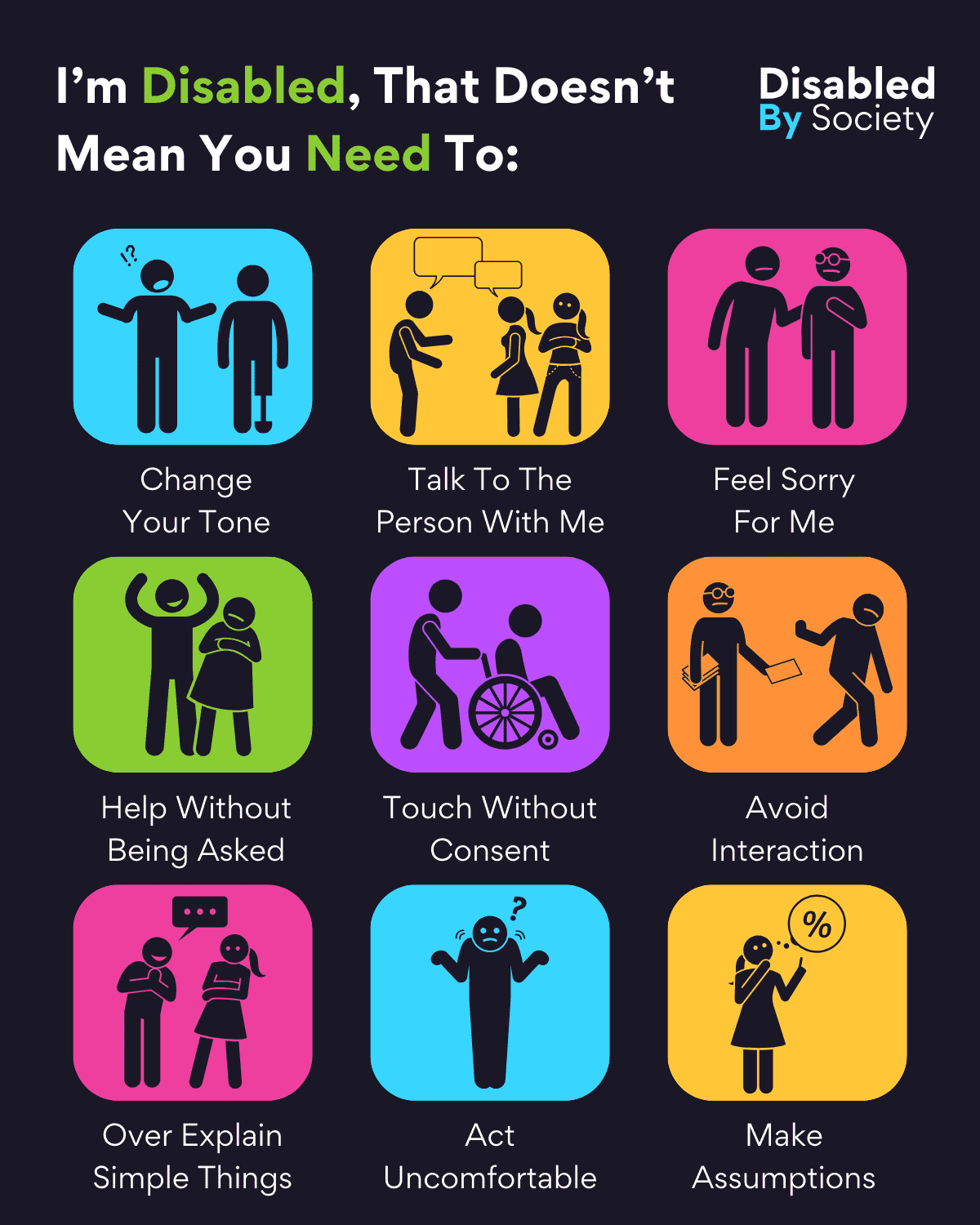 ID: A Disabled by Society graphic set on a dark background titled “I’m Disabled, That Doesn’t Mean You Need To:” featuring nine colourful icons with text describing behaviours to avoid when interacting with Disabled people. These include: (Blue icon) “Change Your Tone” showing a person speaking differently to another; (Yellow icon) “Talk To The Person With Me” depicting someone ignoring the Disabled person to speak to their companion; (Pink icon) “Feel Sorry For Me” with one person patting another sympathetically; (Green icon) “Help Without Being Asked” showing unsolicited assistance; (Purple icon) “Touch Without Consent” illustrating someone pushing a wheelchair without permission; (Orange icon) “Avoid Interaction” showing a person walking away from someone trying to engage; (Pink icon) “Over Explain Simple Things” depicting slow, exaggerated speech; (Blue icon) “Act Uncomfortable” with a confused person and question mark; and (Yellow icon) “Make Assumptions” showing a person thinking with a percentage symbol, representing assumptions.