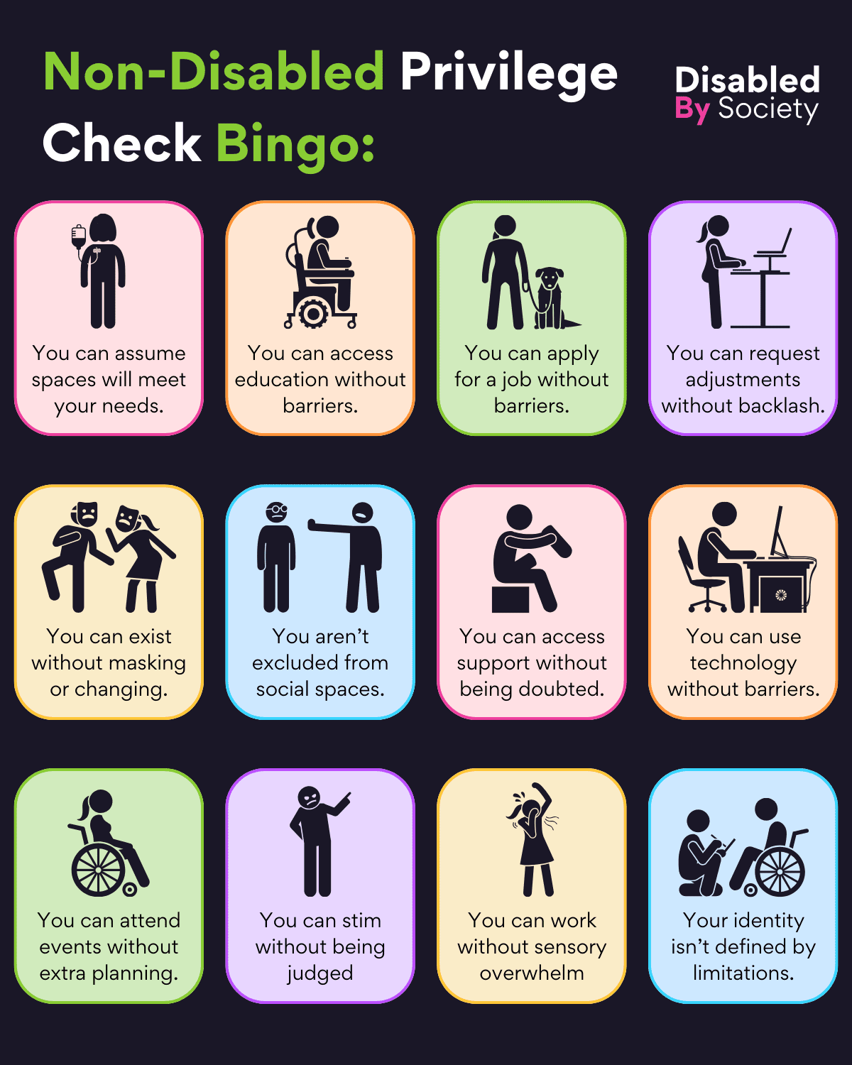 ID: A Disabled by Society graphic titled “Non-Disabled Privilege Check Bingo.” Below are 12 colourful boxes, each highlighting a privilege that non-Disabled people often take for granted: 1. You can assume spaces will meet your needs – a person with a medical device attached to them. 2. You can access education without barriers – a person using a powered wheelchair. 3. You can apply for a job without barriers – a person with a service dog. 4. You can request adjustments without backlash – a person working at a standing desk. 5. You can exist without masking or changing – two people wearing masks. 6. You aren’t excluded from social spaces – a person being declined access with an open hand. 7. You can access support without being doubted – a person sitting on a bench, adjusting their prosthetic. 8. You can use technology without barriers – a person using a computer. 9. You can attend events without extra planning – a person in a wheelchair holding a ticket. 10. You can stim without being judged – person flapping their hands. 11. You can work without sensory overwhelm. – overwhelmed person covering their ears. 12. Your identity isn’t defined by limitations – a person using a wheelchair.
