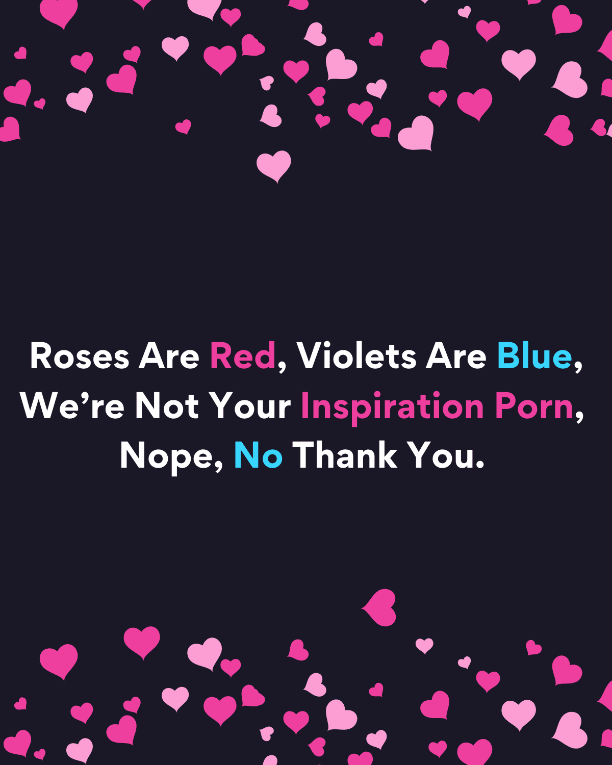 ID: A Disabled by Society graphic with a dark background and pink-themed elements, featuring heart-shaped bunting and the Disabled by Society logo at the top. The main text reads, “Roses Are Red, Ableism Is Real, If You Don’t Unlearn It, Society Will Fail..” Below are nine pink icons with white text representing aspects of accessibility and inclusion: Include Disabled Voices (person with crutch), Attract Diverse Talent (magnifying glass over three people), Represent Human Diversity (people in a circular pattern), Accommodate Ageing Needs (elderly couple with walking aids), Embrace Difference (signpost with arrows), Challenge Systemic Bias (person holding scales), Create Equity (balanced scales with different weights), Invest in Inclusion (hands holding a group of people), Unlearn Outdated Beliefs (person reading with speech bubble). The design uses bold visuals to emphasise unlearning ableism and fostering inclusion.