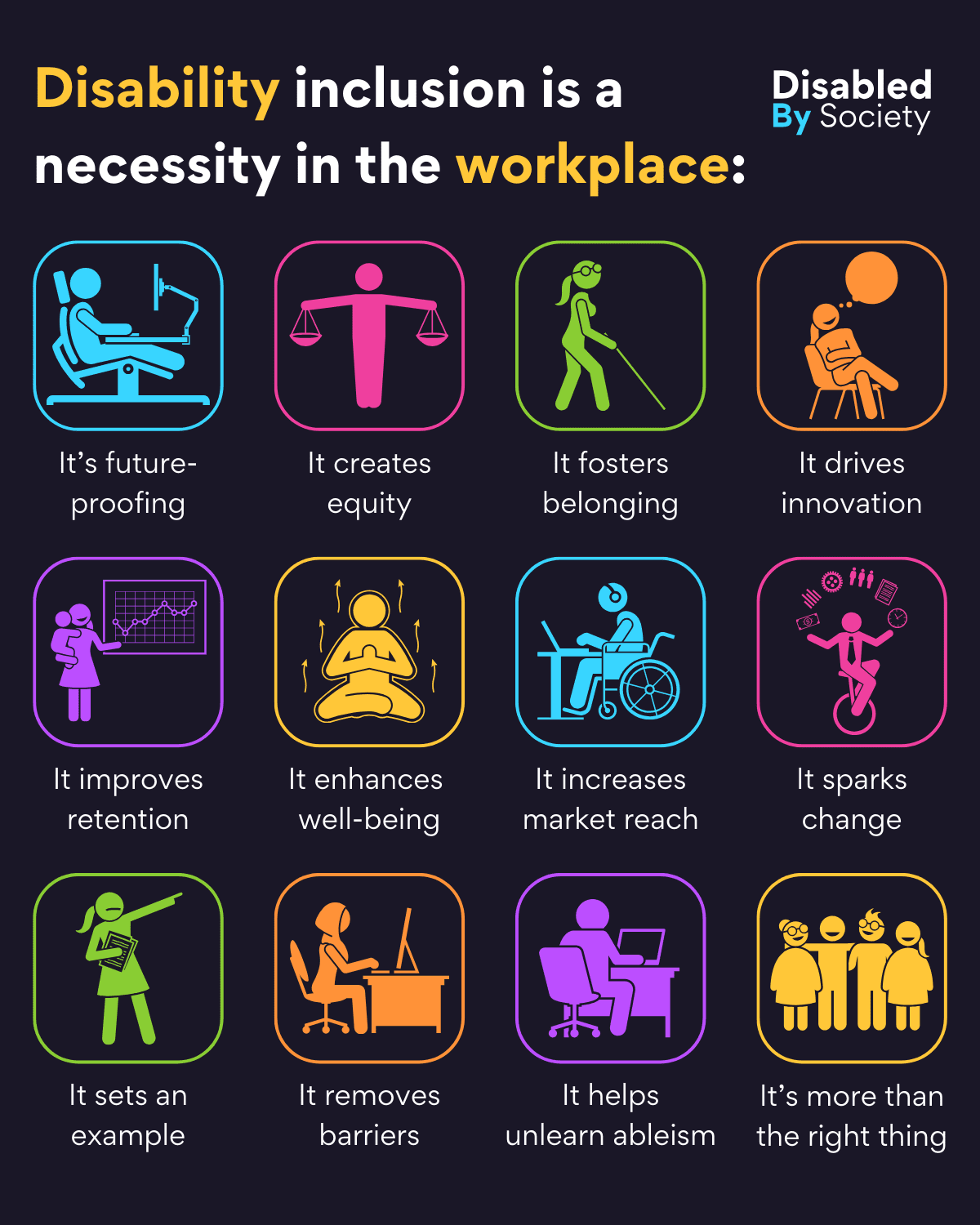 ID: Disabled by Society graphic titled “Disability Inclusion is a Necessity in the Workplace,” set on a dark background with bright colourful stick-person icons and statements: “It’s future-proofing” – person sitting in adapted bed working; “It creates equity” – figure holding balanced scales; “It fosters belonging” – person with cane navigating happily; “It drives innovation” – person with thought bubble; “It improves retention” – parent holding child while delivering meeting; “It enhances well-being” – person meditating with calming energy; “It increases market reach” – wheelchair user engaging with website; “It sparks change” – person balancing on unicycle juggling; “Sets an example” – confident person pointing forward; “It removes barriers” – person using computer with screen reader; “Helps unlearn ableism” – person using desktop computer; “It’s more than the right thing” – group of diverse people.