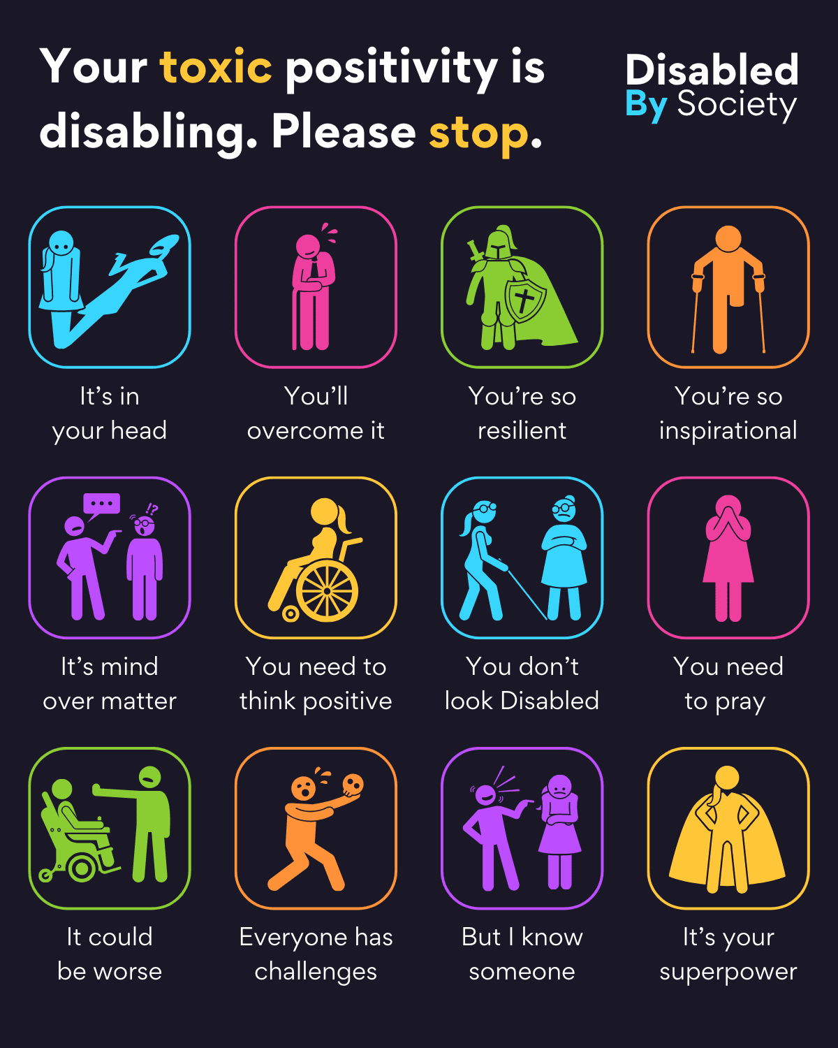 ID: Disabled by Society graphic titled “Your Toxic Positivity is Disabling. Please Stop,” set on a dark background with bright colourful stick-person icons and statements: “It’s in your head” – person with shadow shouting; “You’ll overcome it” – figure clutching stomach and cane; “You’re so resilient” – person dressed as warrior; “You’re so inspirational” – person using crutches simply existing; “It’s mind over matter” – person speaking to confused other; “You need to think positive” – wheelchair user staring; “You don’t look Disabled” – person judging cane user; “You need to pray” – person praying; “It could be worse” – standing person pointing at wheelchair user; “Everyone has challenges” – person running away from comment; “But I know someone” – person gesturing talking to another; “It’s your superpower” – person proudly standing with cape.