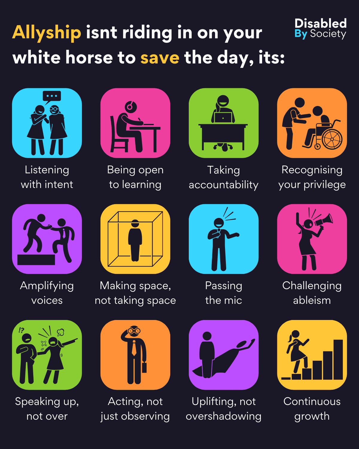 ID: Disabled by Society graphic titled “Allyship isn’t riding in on your white horse to save the day, it’s:”, set on a dark background with bright colourful stick-person icons and statements: “Listening with intent” – two people, one speaking; “Being open to learning” – person at desk studying; “Taking accountability” – person at laptop making content accessible; “Recognising your privilege” – person speaking to wheelchair user; “Amplifying voices” – one person helping another onto higher platform; “Making space, not taking space” – person standing inside clear box; “Passing the mic” – person hogging microphone; “Challenging ableism” – person shouting into megaphone; “Speaking up, not over” – person reacting as another speaks over angrily; “Acting, not just observing” – person watching with binoculars; “Uplifting, not overshadowing” – person centring themselves, shadow not a superhero; “Continuous growth” – person climbing blocks symbolising progress.