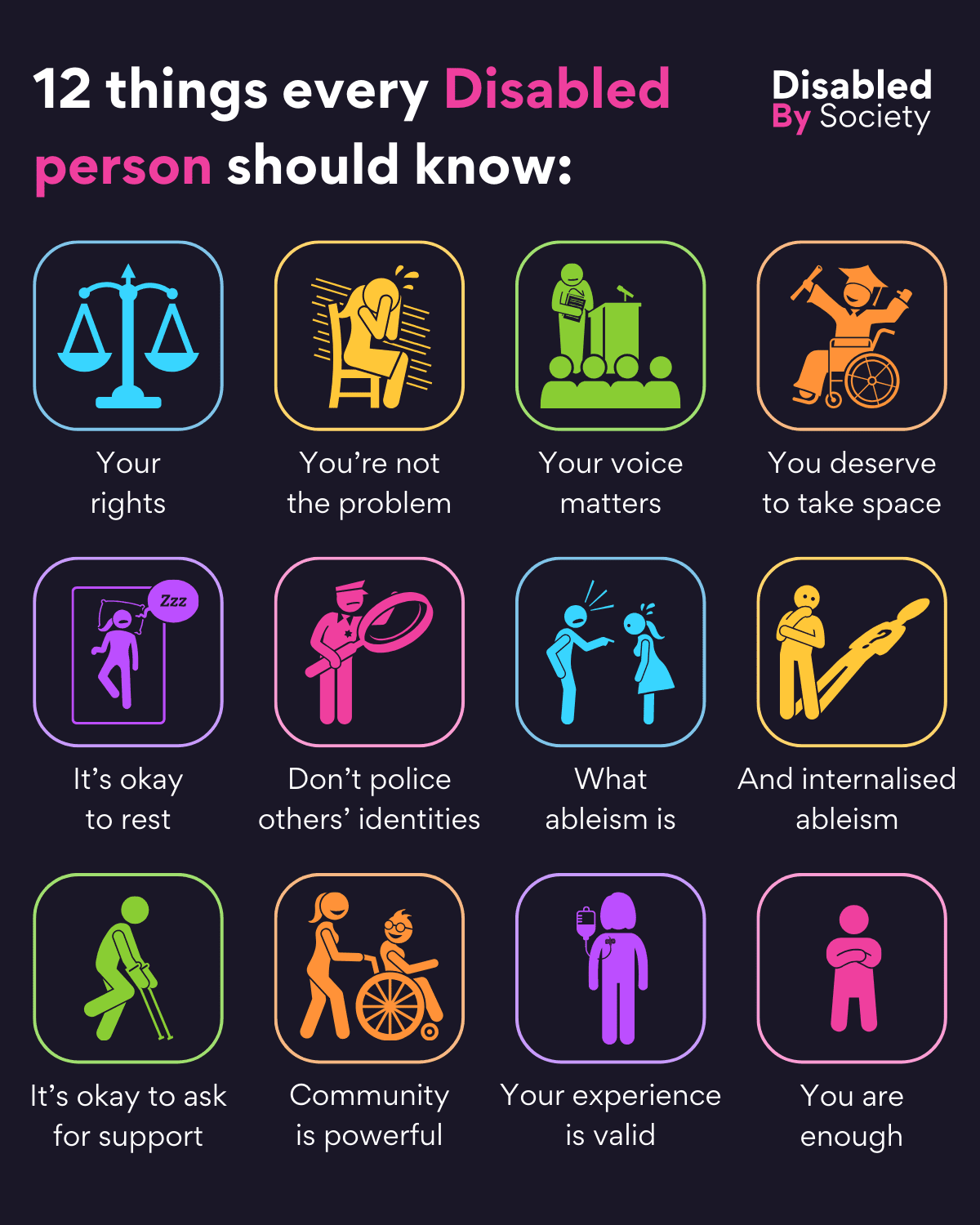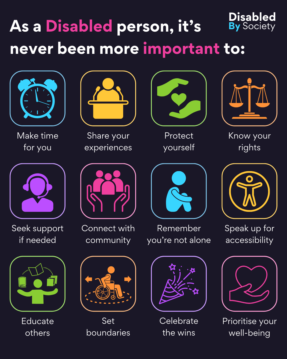 ID: A Disabled by Society graphic with a dark background featuring colourful square icons and text. The title reads, “As a Disabled person, it’s never been more important to:” Below are twelve differently coloured icons with text: 1. Blue alarm clock – “Make time for you”. 2. Yellow person speaking at a podium with microphones – “Share your experiences”. 3. Green hands holding a heart – “Protect yourself”. 4. Orange scales of justice – “Know your rights”. 5. Purple person wearing a headset – “Seek support if needed”. 6. Pink three people held by two hands – “Connect with community”. 7. Blue person sitting with arms wrapped around knees – “Remember you’re not alone”. 8. Yellow person with open arms in a circle – “Speak up for accessibility”. 9. Green person holding books and papers – “Educate others”. 10. Orange wheelchair user moving between two arrows – “Set boundaries”. 11. Purple party hat with confetti and stars – “Celebrate the wins”. 12. Pink hand holding a heart – “Prioritise your well-being”.