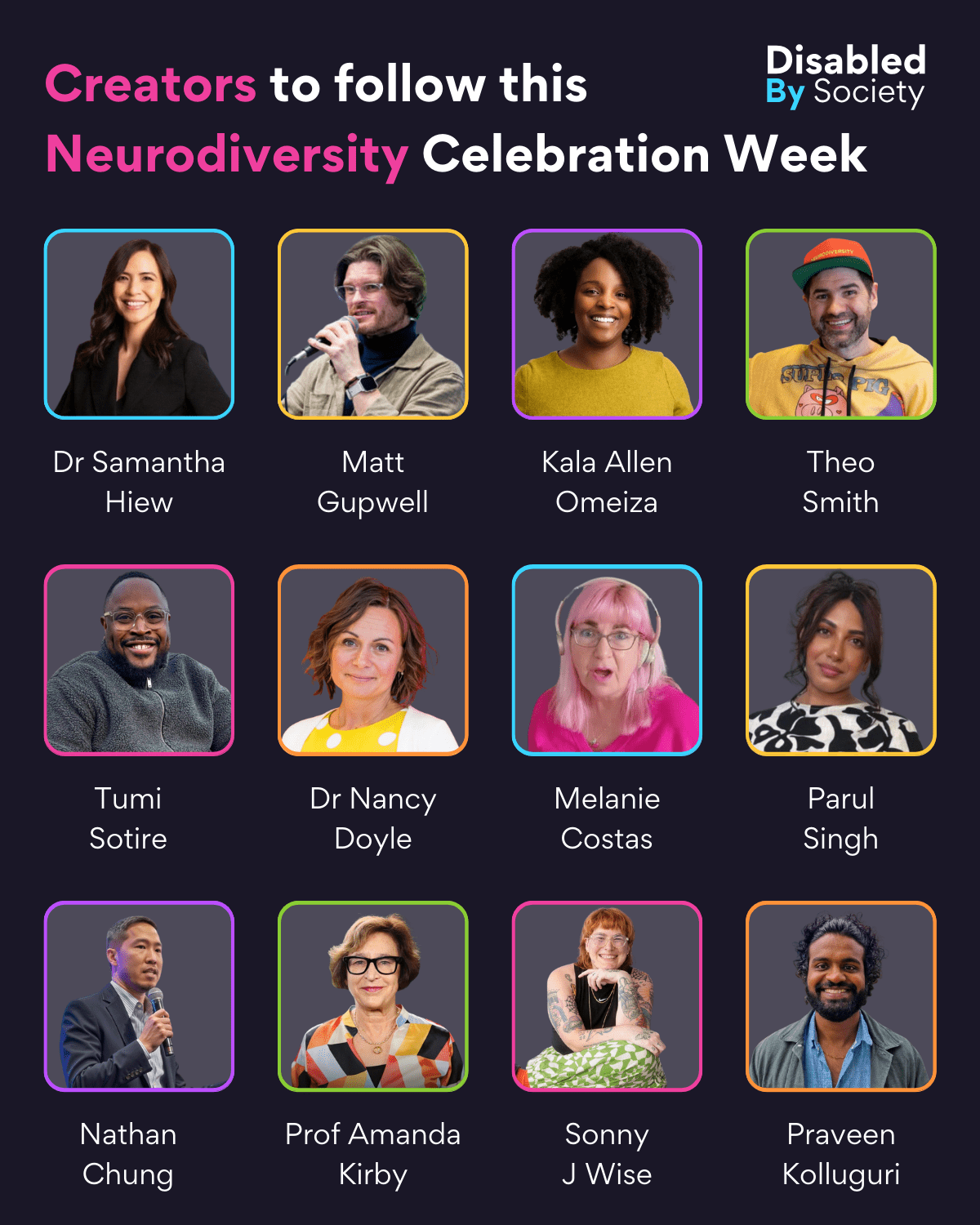 ID: promotional Disabled by Society graphic with a dark background and colourful accents highlighting twelve diverse creators to follow for Neurodiversity Celebration Week. The title features bold, colourful typography emphasising “Creators,” “Neurodiversity,” and “Celebration Week.” Twelve creators’ names and photos are displayed, each framed in a different vibrant colour: Dr Samantha Hiew, Matt Gupwell, Kala Allen Omeiza, Theo Smith, Tumi Sotire, Dr Nancy Doyle, Melanie Costas, Parul Singh, Nathan Chung, Prof Amanda Kirby, Sonny J Wise, and Praveen Kolluguri.