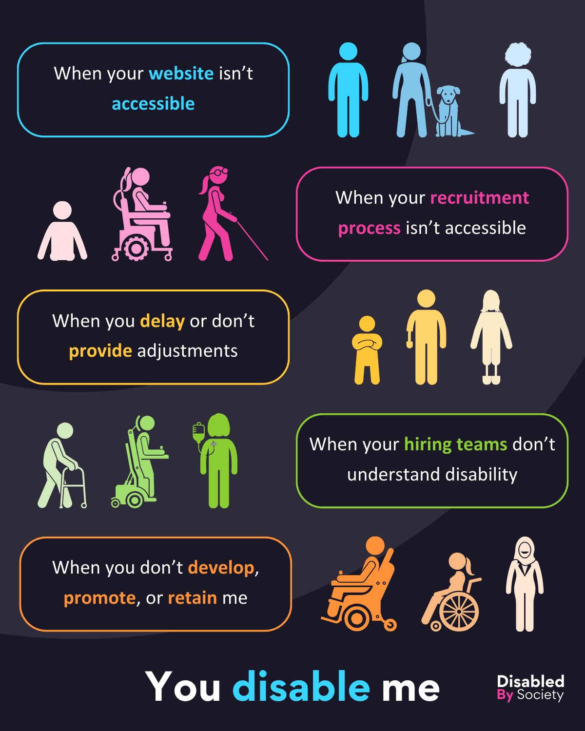 ID: A Disabled By Society infographic titled “You disable me” with a dark background and colourful text. The graphic features five statements highlighting accessibility barriers in employment, each accompanied by three stick-figure icons representing visible and non-visible disabilities. The statements read: “When your website isn’t accessible,” “When your recruitment process isn’t accessible,” “When you delay or don’t provide adjustments,” “When your hiring teams don’t understand disability,” and “When you don’t develop, promote, or retain me.” At the bottom, the phrase “You disable me” appears in white and blue. The Disabled By Society logo is in the bottom right corner.