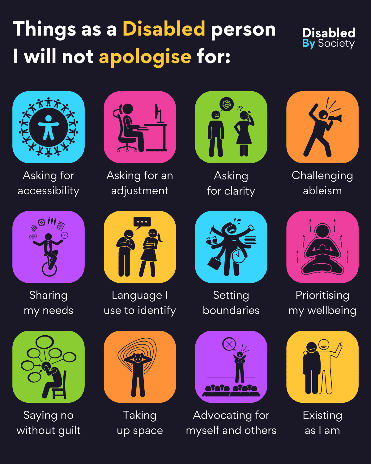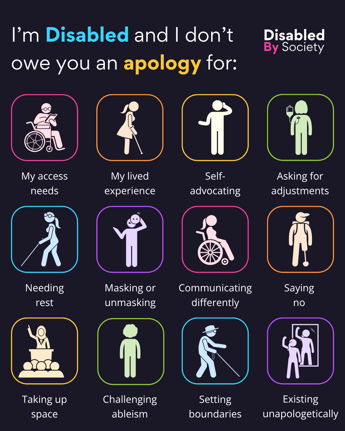 ID: A Disabled by Society graphic called, “I’m Disabled, and I don’t owe you an apology for:” Featuring 12 icons and accompanying text. Each icon is inside a colorful rounded square, with simple illustrations of disabled people confidently engaging in various actions. The reasons listed include: My access needs (wheelchair user reading a tablet). My lived experience (blind woman with a cane). Self-advocating (person speaking up). Asking for adjustments (person with an IV). Needing rest (blind person walking with a cane). Masking or unmasking (person holding a mask). Communicating differently (wheelchair user speaking). Saying no (person with a prosthetic leg). Taking up space (person at a podium). Challenging ableism (a person standing person with non-visible Disability). Setting boundaries (older person walking). Existing unapologetically (Disabled person celebrating in front of a mirror).