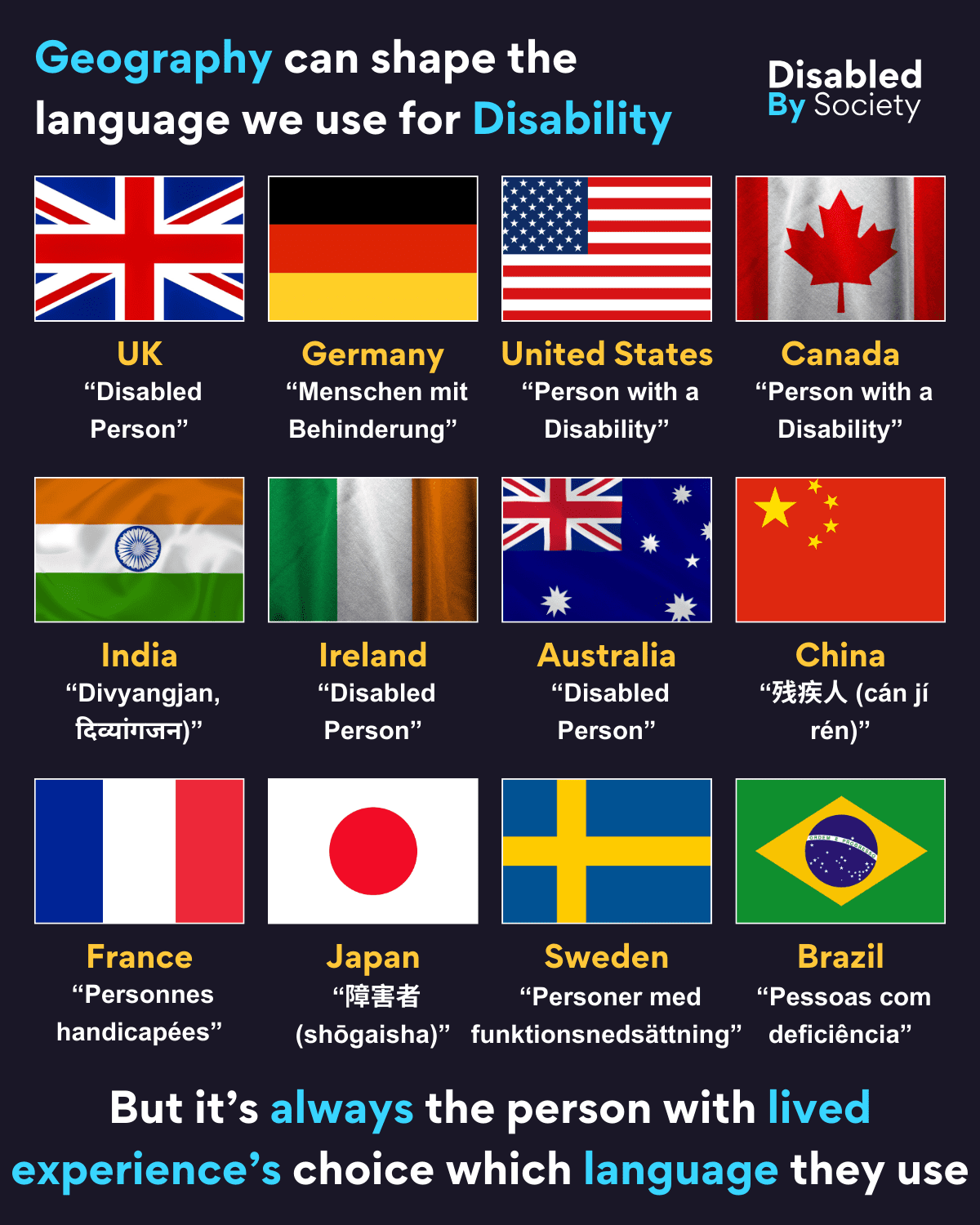 ID: Disabled by Society graphic titled “Geography Can Shape the Language We Use”, set on a dark background. Features a visual map with labels or text highlighting how different countries or regions may use varied terms related to disability, identity, or accessibility. The graphic explores how location influences language, including differences in terminology, cultural framing, and systems like healthcare, education, or legislation.