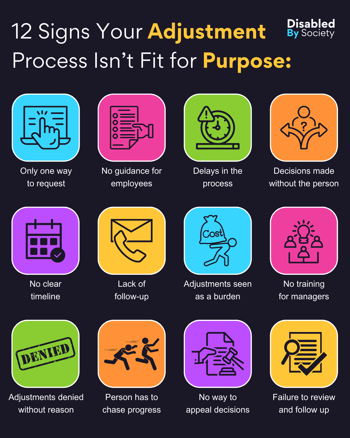 ID: Disabled by Society graphic titled “12 Signs Your Adjustment Process Isn’t Fit for Purpose”, set on an off-black background. Features a colourful 3×4 grid of curved squares with icons and text labels: “Only one way to request” – computer monitor; “No guidance for employees” – speech bubble with question mark; “Delays in the process” – snail; “Decisions made without the person” – two figures, one crossed out; “No clear timeline” – calendar with question mark; “Lack of follow-up” – incomplete checklist; “Adjustments seen as a burden” – heavy weight; “No training for managers” – crossed-out graduation cap; “Adjustments denied without reason” – red cross over document; “Person has to chase progress” – running figure and clock; “No way to appeal decisions” – locked door; “Failure to review and follow up” – incomplete circular arrow.