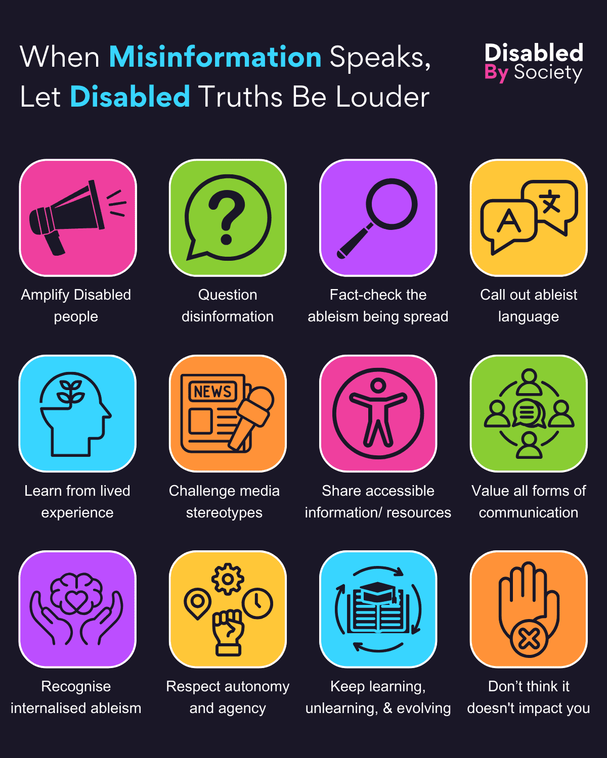 ID: Disabled by Society graphic titled “When Misinformation Speaks, Let Disabled Truths Be Louder”, set on a dark background. Features 12 colourful square icons in a 3×4 grid, each with a symbol and statement: pink megaphone – “Amplify Disabled people”; green question mark – “Question disinformation”; purple magnifying glass – “Fact-check ableism”; yellow speech bubbles – “Call out ableist language”; blue head with sprout – “Learn from lived experience”; orange newspaper and microphone – “Challenge media stereotypes”; pink access symbol – “Share accessible info/resources”; green group of people – “Value all communication forms”; purple hands holding heart-brain – “Recognise internalised ableism”; yellow gears and fist – “Respect autonomy and agency”; blue circular arrows around book – “Keep learning, unlearning & evolving”; orange raised hand with X – “Don’t think it doesn’t impact you”.