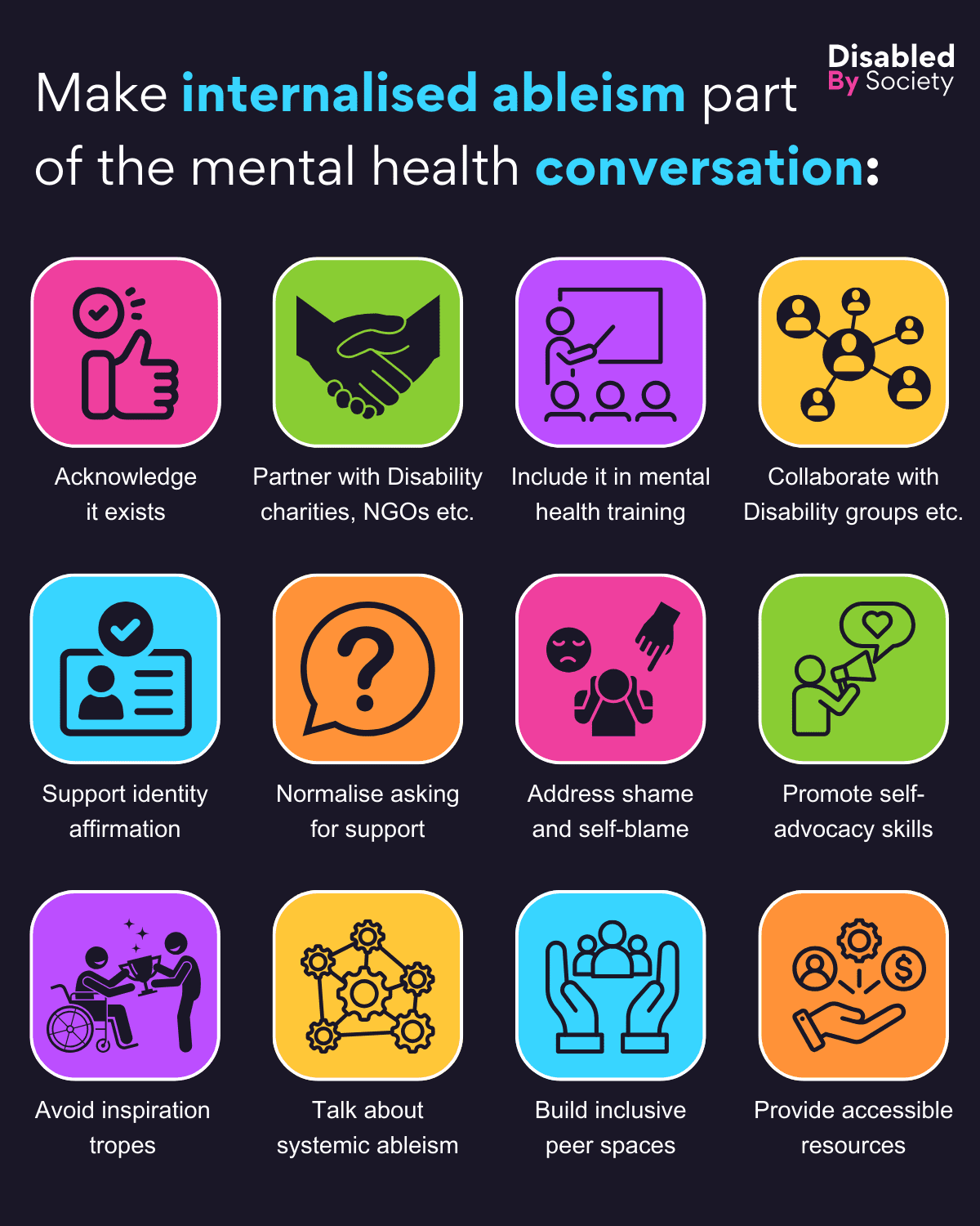 ID: Disabled by Society graphic titled “Make internalised ableism part of the mental health conversation”, set on a dark background. Features 12 colourful icons with headings suggesting ways to include internalised ableism in mental health discussions: pink thumbs-up – “Acknowledge it exists”; green handshake – “Partner with Disability charities and NGOs”; purple person presenting – “Include in mental health training”; yellow network – “Collaborate with Disability groups”; light blue ID card – “Support identity affirmation”; orange question mark – “Normalise asking for support”; pink overwhelmed person – “Address shame and self-blame”; green megaphone user – “Promote self-advocacy skills”; purple person in wheelchair receiving help – “Avoid inspiration tropes”; yellow gears – “Discuss systemic ableism”; blue hands holding group – “Build inclusive peer spaces”; orange money and gear – “Provide accessible resources”.