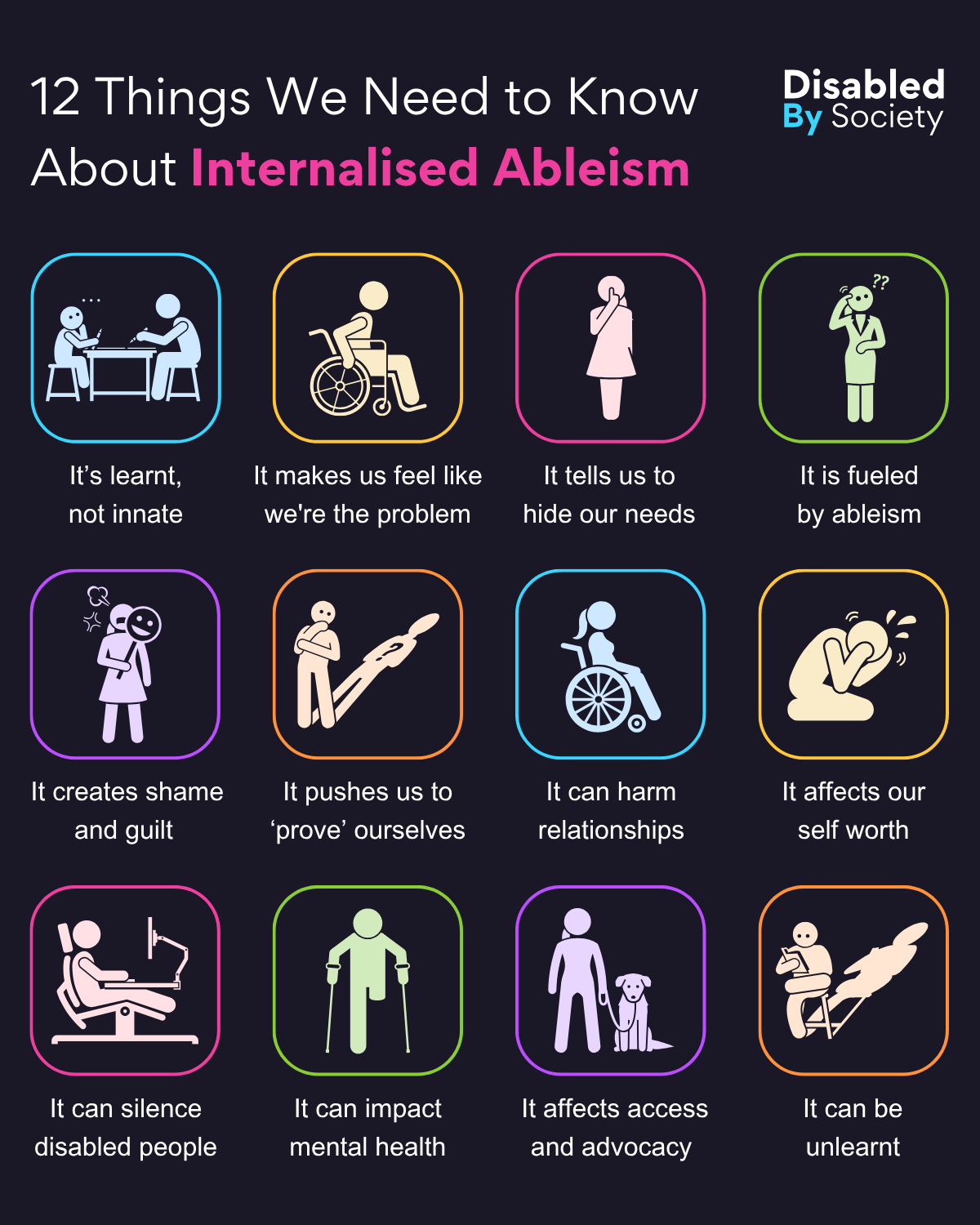 ID: Disabled by Society graphic titled “12 Things We Need to Know About Internalised Ableism”, set against a dark background. A grid of 12 colourful icons with stylised illustrations and captions highlights key points: “It’s learnt, not innate” – young person at a table with an adult; “It makes us feel like we’re the problem” – wheelchair user looking down; “It tells us to hide our needs” – person nervously holding their hands; “It’s driven by ableism” – figure with question marks overhead; “It creates shame and guilt” – person hiding behind a mask; “It pushes us to ‘prove’ ourselves” – figure facing their own shadow; “It can harm relationships” – wheelchair user alone; “It affects our self-worth” – crouched person covering their face; “It can silence disabled people” – person at a desk with a screen; “It can impact mental health” – figure with walking aids; “It affects access and advocacy” – person beside a guide dog; and “It can be unlearnt” – seated figure reading with a shadow behind.