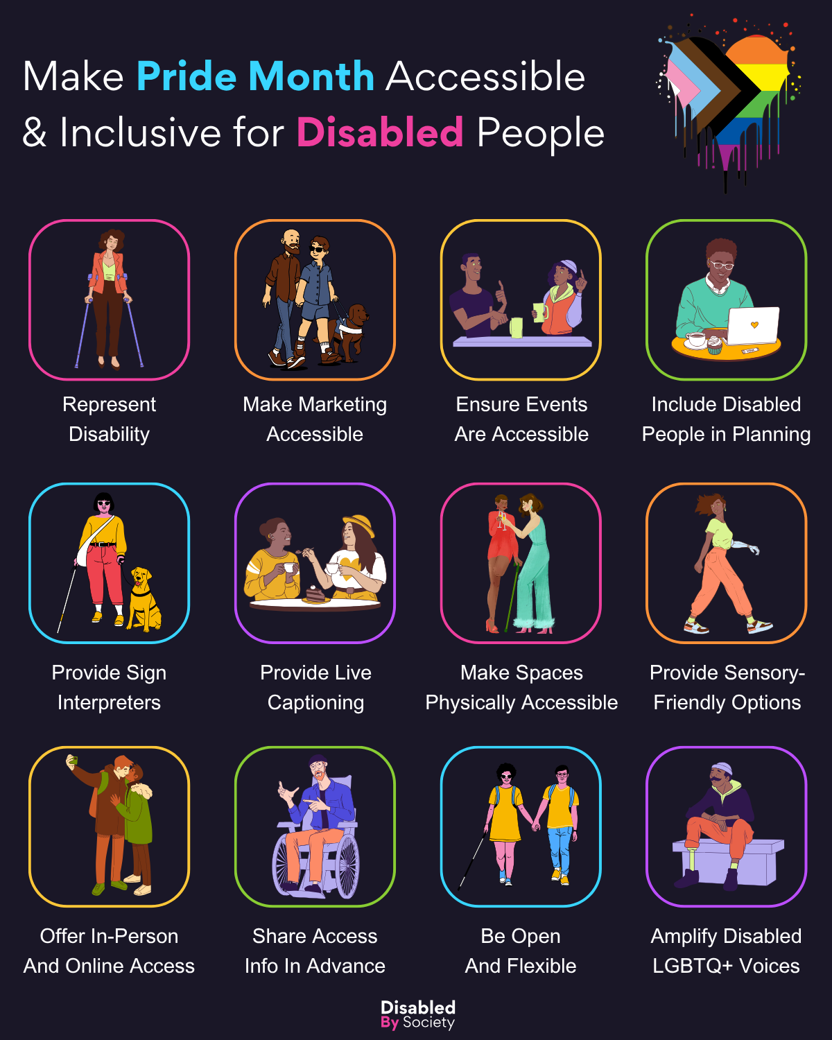 ID: Disabled by Society graphic titled “Make Pride Month Accessible & Inclusive for Disabled People,” set on a dark background with a dripping Progress Pride flag in the top right. Shows 12 colorful icons with stylized illustrations and captions suggesting inclusive practices: “Represent Disability” – person using crutches; “Make Marketing Accessible” – gay couple, one with a guide dog; “Ensure Events Are Accessible” – stylish person with white cane and guide dog; “Include Disabled People in Planning” – person using laptop with Pride sticker; “Provide Sign Interpreters” – two people signing at a table; “Provide Live Captioning” – two people chatting; “Make Spaces Physically Accessible” – gay couple, one with a walking aid and limb difference; “Provide Sensory-Friendly Options” – person with prosthetic arm walking away from sensory overload; “Offer In-Person and Online Access” – gay couple taking a selfie; “Share Access Info In Advance” – wheelchair user gesturing; “Be Open and Flexible” – two people holding hands, one using a cane; “Amplify Disabled LGBTQ+ Voices” – seated person with limb difference.