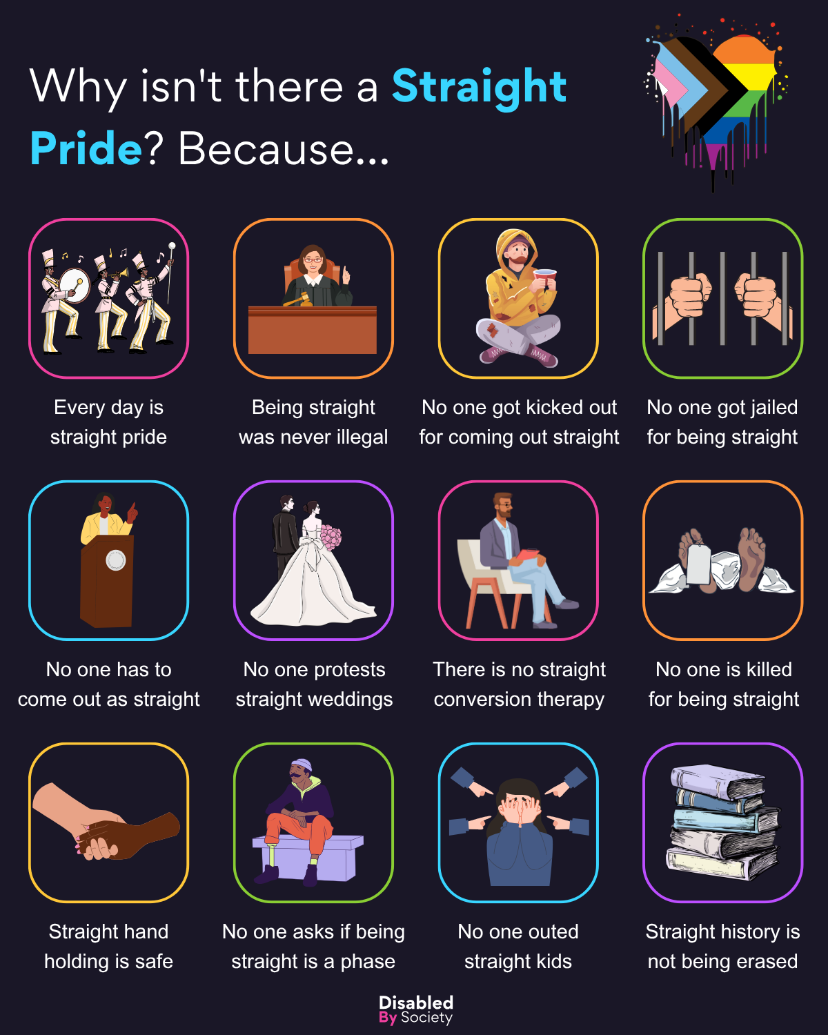 ID: Disabled by Society graphic titled “Why isn’t there a Straight Pride? Because…”, set on a dark background with a dripping Progress Pride flag in the top right. Features 12 colorful icons in a grid, each illustrating straight privilege: marching band (every day is straight pride), judge (being straight was never illegal), person made homeless (no one kicked out for coming out straight), prison bars (no one jailed for being straight), speaker at podium (no need to come out as straight), wedding couple (no protests against straight weddings), therapist (no straight conversion therapy), tagged body (no one killed for being straight), hands holding safely (straight hand holding is safe), person on bench (no one asks if being straight is a phase), pointing crowd (no one outed straight kids), stack of books (straight history isn’t being erased).