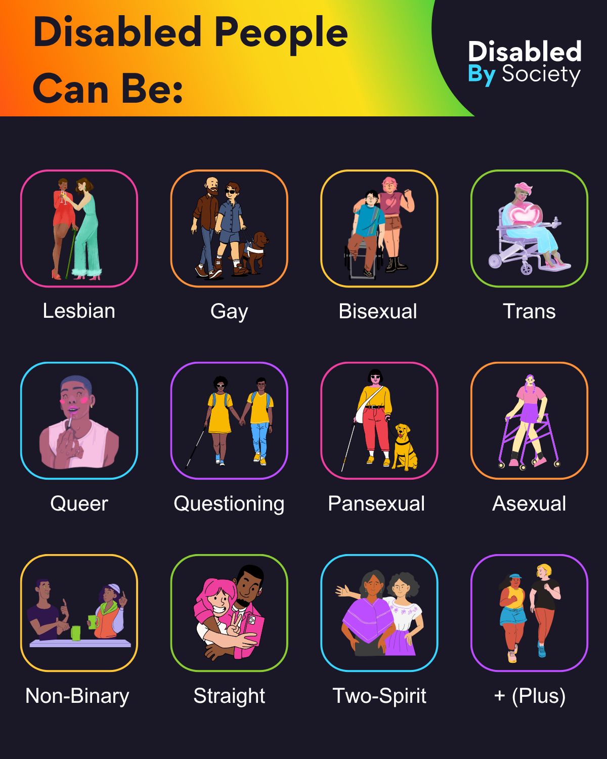 ID: Disabled by Society graphic titled “Disabled People Can Be:”, on a dark background with a rainbow gradient top. Shows 12 colorful icons in a 4×3 grid, each featuring disabled individuals representing LGBTQIA+ identities. Captions include: Lesbian – two women, one with a white cane; Gay – two men, one guiding a service dog; Bisexual – person in a wheelchair hugged by partner; Trans – person in a wheelchair holding a glowing heart; Queer – confident person with stylish hair and nail polish; Questioning – two cane users holding hands; Pansexual – person with guide dog and sunglasses; Asexual – smiling person with a pink walker; Non-Binary – two people chatting, one using ASL; Straight – a couple hugging; Two-Spirit – two people talking; Plus – two people running, one with Down Syndrome. Disabled by Society logo appears in the top right. Affirms disabled people exist across all sexual and gender identities.