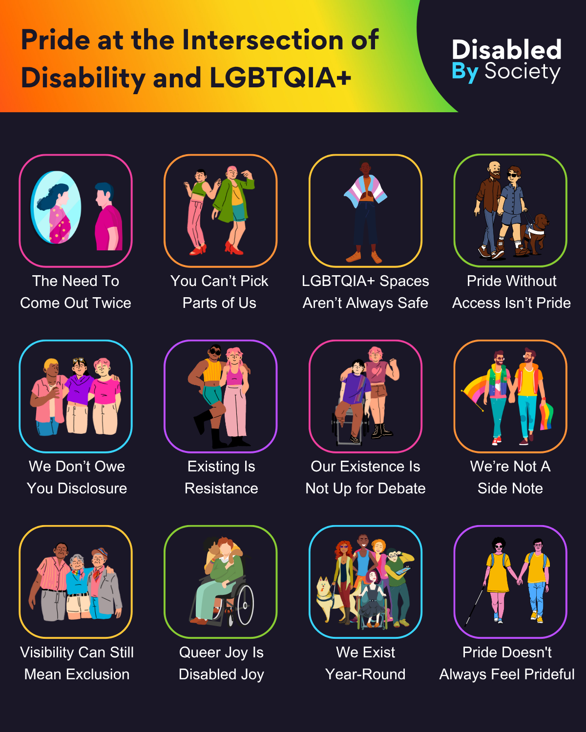 ID: Disabled by Society graphic titled “Pride at the Intersection of Disability and LGBTQIA+” on a dark background with a rainbow-gradient banner. Features 12 colorful icons with stylized illustrations representing queer disabled experiences. Captions include: The Need to Come Out Twice – person seeing different gender in mirror; You Can’t Pick Parts of Us – two people living fully; LGBTQIA+ Spaces Aren’t Always Safe – person with Trans flag; Pride Without Access Isn’t Pride – couple with guide dog; We Don’t Owe You Disclosure – three friends together; Existing Is Resistance – two people strutting confidently; Our Existence Is Not Up for Debate – person using wheelchair; We’re Not a Side Note – couple wrapped in Pride flags; Visibility Can Still Mean Exclusion – older queer friend group; Queer Joy Is Disabled Joy – wheelchair user holding glowing heart; We Exist Year-Round – diverse group with visible/invisible disabilities; Pride Doesn’t Always Feel Prideful – couple holding hands, one with white cane.