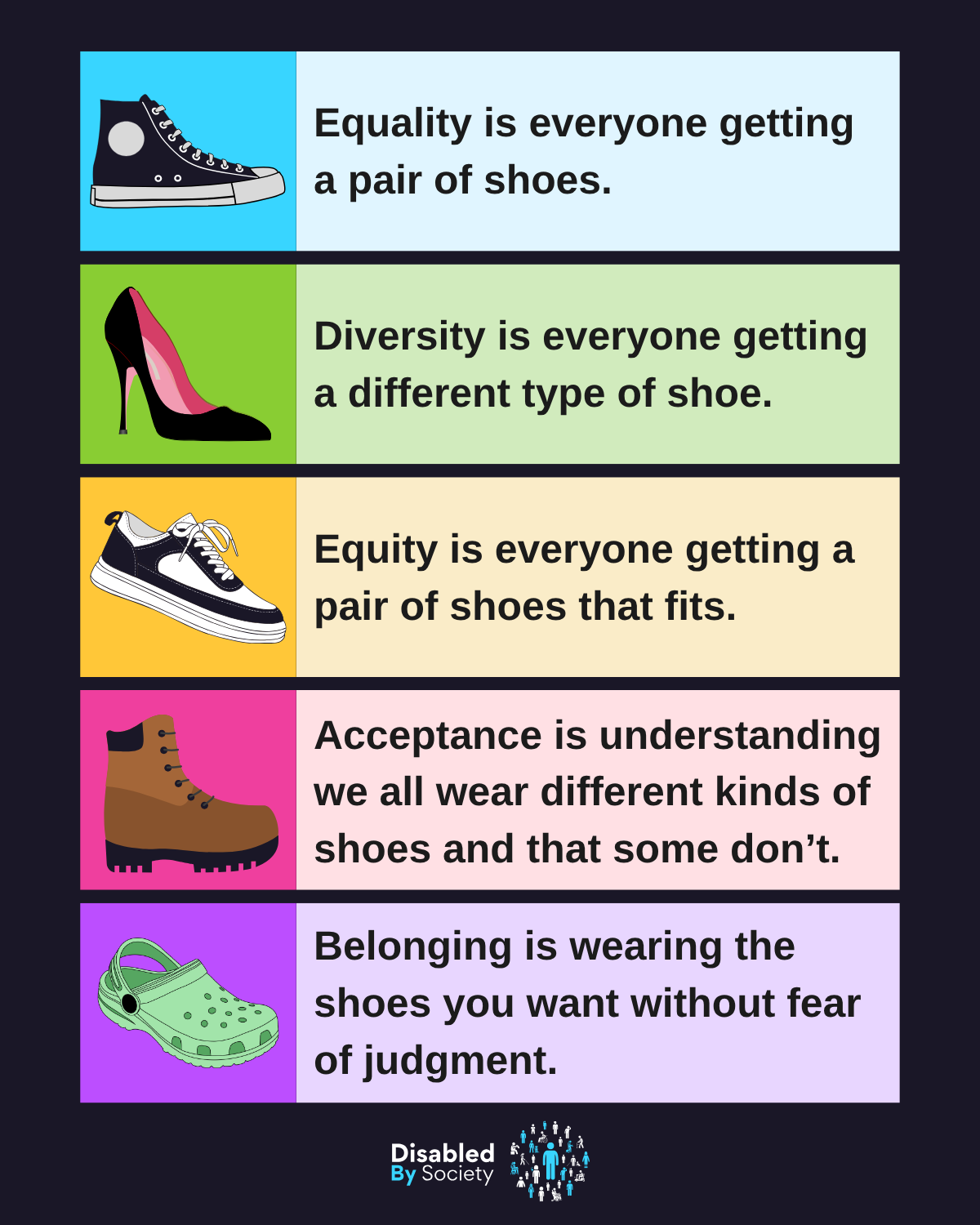 ID: Disabled By Society graphic set on a dark background. Five boxes with a shoe and paragraph appear in a vertical alignment. They read: Equality is everyone getting a pair of shoes. Diversity is everyone getting a different type of shoe. Equity is everyone getting a pair of shoes that fits. Acceptance is understanding we all wear different kinds of shoes and that some don’t. Belonging is wearing the shoes you want without fear of judgment.