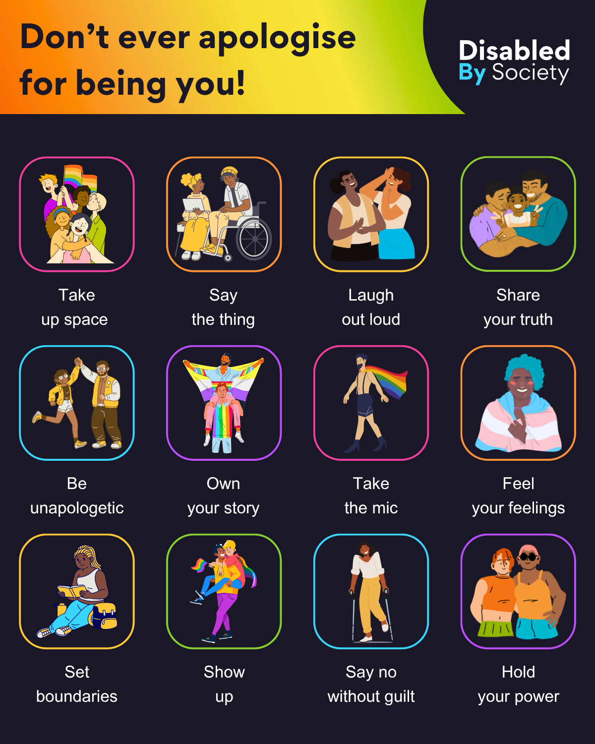 ID: A Disabled by Society graphic titled, “Don’t ever apologise for being you”. Below the title are 12 illustrated squares, each with a positive affirmation and an inclusive illustration. The illustrations show diverse representation in terms of race, gender expression, body type, and Disability. Take up space – A group of diverse people smiling, holding a rainbow flag. Say the thing – Two people talking, one using a wheelchair. Laugh out loud – Two people laughing together. Share your truth – Two dads hugging their child. Be unapologetic – Two friends high-fiving. Own your story – A person draped in a rainbow flag proudly spreading their arm on the shoulders of another person. Take the mic – A male presenting person striding confidently with a rainbow flag cape and heels. Feel your feelings – A smiling person wrapped in a trans flag. Set boundaries – A person sitting on the floor reading a book. Show up – Two people walking, one carrying the other on their back with rainbow accessories. Say no without guilt – A person standing confidently using forearm crutches. Hold your power – Two people standing strong side by side, one wearing sunglasses.
