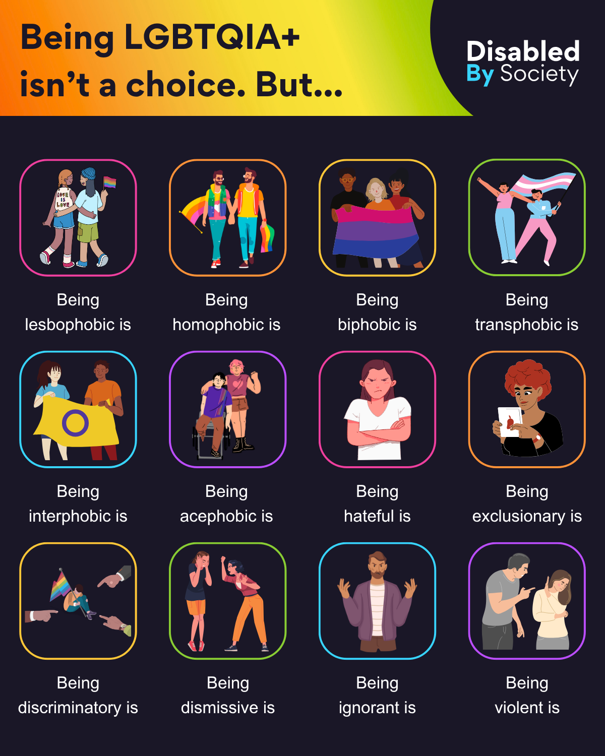 ID: A Disabled by Society infographic titled “Being LGBTQIA+ isn’t a choice. But.” It features twelve illustrated boxes, with a short caption, they read: “Being lesbophobic is” – two women holding hands and holding a pride flag. “Being homophobic is” – two men holding hands with rainbow flags. “Being biphobic is” – a diverse group holding a bisexual pride flag. “Being transphobic is” – two people dancing with the transgender pride flag. “Being interphobic is” – two people holding the intersex pride flag. “Being acephobic is” – two people, one in a wheelchair, stand side by side. “Being hateful is” – a person crossing their arms with an angry expression. “Being exclusionary is” – a person looking at a redacted profile photo. “Being discriminatory is” – hands pointing fingers at a person with a pride flag. “Being dismissive is” – one person shouting at another who appears taken aback. “Being ignorant is” – a person being ignorant to what’s happening around them. “Being violent is” – a man yelling at a woman who is cowering