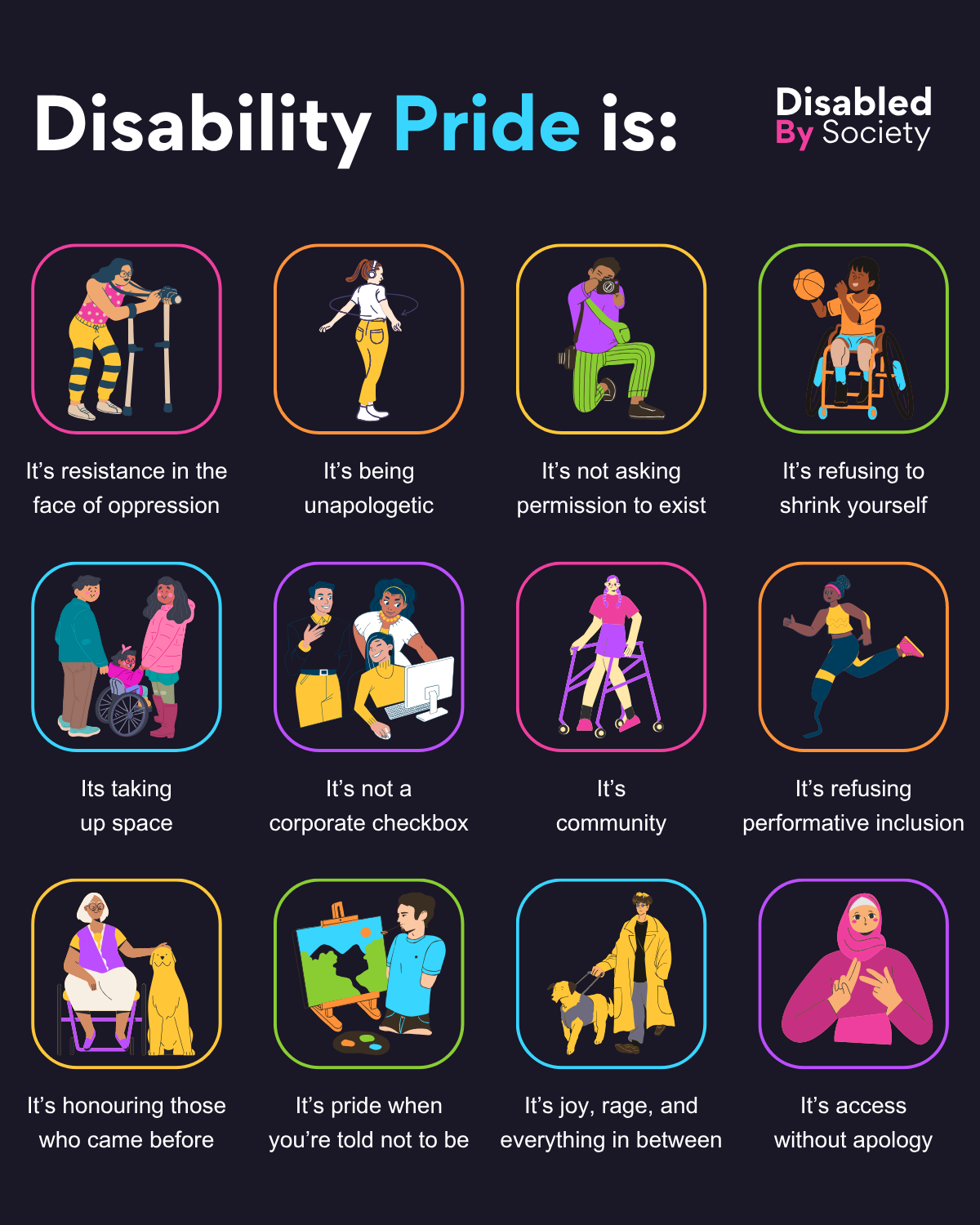 ID: A Disabled by Society graphic titled “Disability Pride is.” It features 12 colorful illustrations, each showing an aspect of disability pride. Descriptions include: resistance in the face of oppression (person using a walker taking a photo), being unapologetic (person spinning with noise-canceling headphones), not asking permission to exist (person with upper limb difference taking photos), refusing to shrink yourself (wheelchair user playing basketball), taking up space (disabled child with caregiver parents), not a corporate checkbox (group around a computer), community (person with a walker smiling), refusing performative inclusion (runner with prosthetic leg), honouring those who came before (elderly person in a wheelchair with service dog), pride when told not to be (quadruple amputee painting by mouth), joy, rage, and everything in between (person with guide dog), and access without apology (person in a hijab signing).