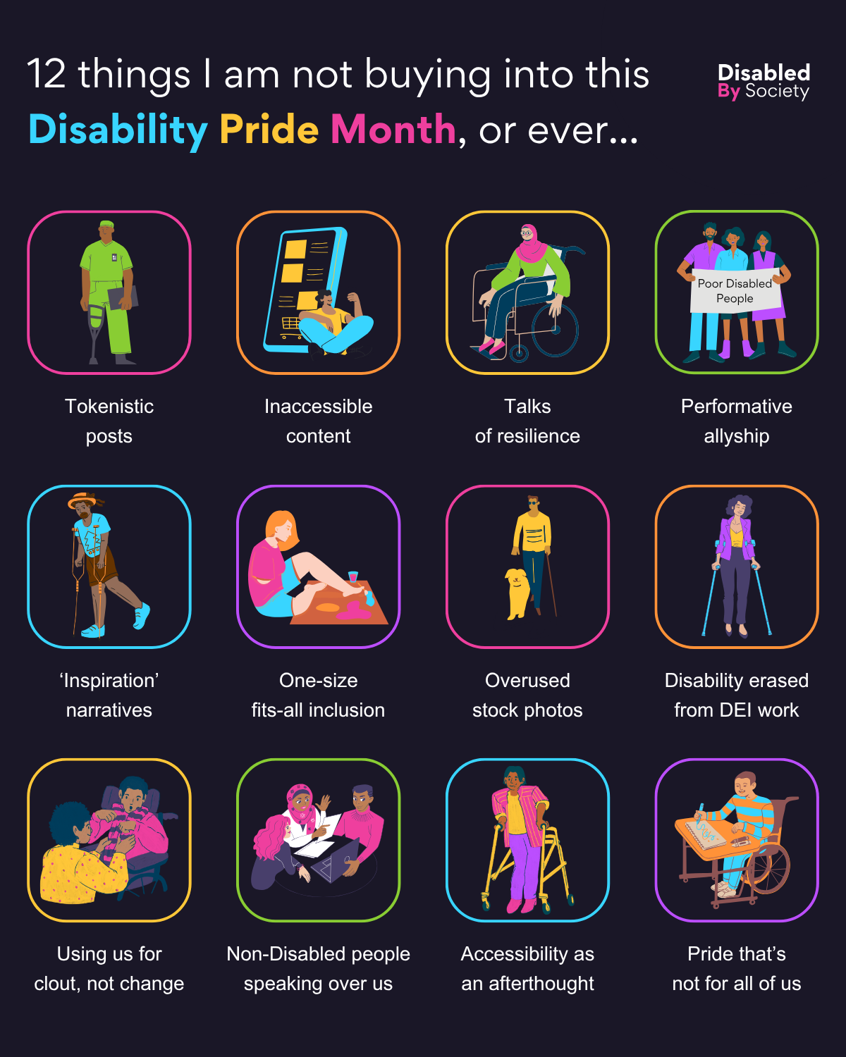 ID: A graphic by Disabled by Society titled “12 things I am not buying into this Disability Pride Month, or ever…” sits above 12 illustrated icons with accompanying captions. They read: Tokenistic posts – A person with a prosthetic leg, representing how one employee is often used as the company’s poster person. Inaccessible content – A person sitting on the ground beside a phone with inaccessible social content. Talks of resilience – A woman using a wheelchair and wearing a hijab. Performative allyship – Three non-disabled people holding a sign that reads “Poor Disabled People.” ‘Inspiration’ narratives – A Black man with a prosthetic leg and cane, illustrating how disabled people are often called inspirational just for existing, rather than for their actions. One-size-fits-all inclusion – A woman painting with her feet due to an upper limb difference. Overused stock photos – A person with a guide dog standing with minimal expression. Disability erased from DEI work – A person with crutches who has broken their leg, representing how disability is often reduced to temporary injury in diversity work. Using us for clout, not change – A disabled person in a wheelchair being touched without consent. Non-disabled people speaking over us – A group of employees discussing how to celebrate Disability Pride Month, none of whom are disabled. Accessibility as an afterthought – A person arriving at an event that has no access. Pride that’s not for all of us – A person in a wheelchair sitting alone in a corner, excluded and scribbling.
