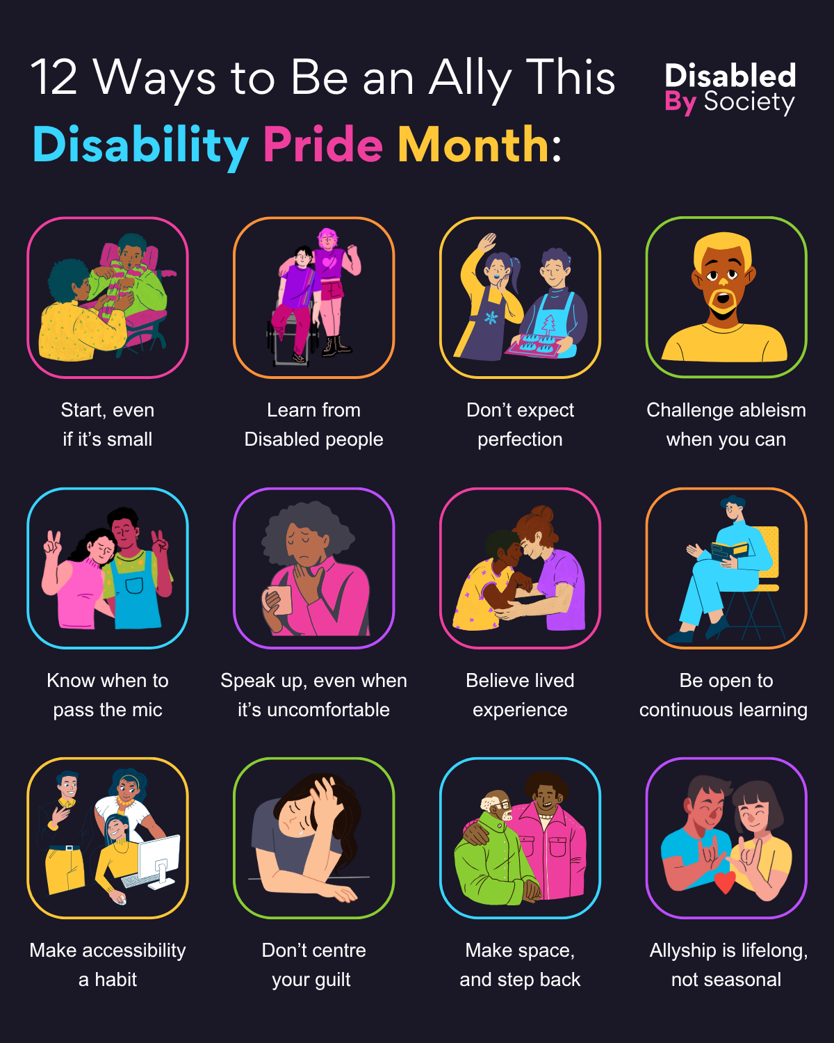 ID: A Disabled by Society graphic titled “12 Ways to Be an Ally This Disability Pride Month”. The background is dark, with colourful icons and illustrations representing each tip. Each tip is in a separate box with a bold outline and an illustrated scene above the text. The 12 tips shown are: Start, even if it’s small – person gently encouraging another. Learn from Disabled people – two people side by side, one using a wheelchair. Don’t expect perfection – two people baking, one raising their hand. Challenge ableism when you can – a person speaking up with an assertive expression. Know when to pass the mic – two people, gesturing peace signs. Speak up, even when it’s uncomfortable – a person holding a cuppa, visibly nervous. Believe lived experience – two people embracing, showing support. Be open to continuous learning – a person reading on a chair with a notebook. Make accessibility a habit – three people at a desk working. Don’t centre your guilt – a person sitting with their head in their hands. Make space, and step back – two people talking. Allyship is lifelong, not seasonal – two people smiling and signing.