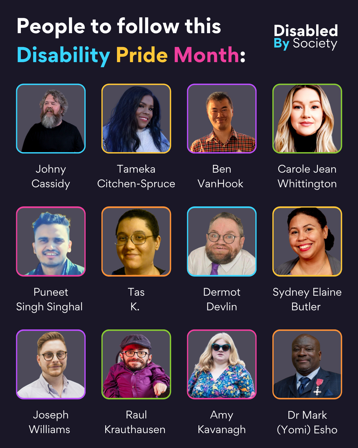 ID: A Disabled by Society graphic titled “People to follow this Disability Pride Month” with the logo “Disabled By Society” in the top right corner. The image features 12 individuals, each in a colored frame with their name beneath their photo. The people shown are: Johny Cassidy. Tameka Citchen-Spruce. Ben VanHook. Carole Jean Whittington. Puneet Singh Singhal. Tas K. Dermot Devlin. Sydney Elaine Butler. Joseph Williams. Raul Krauthausen. Amy Kavanagh. Dr Mark (Yomi) Esho.