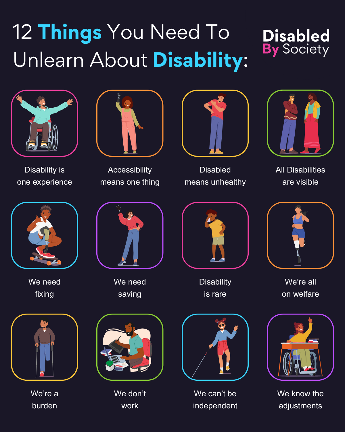 ID: A Disabled by Society infographic titled “12 Things You Need To Unlearn About Disability.” Twelve illustrated tiles are arranged in a 3×4 grid. Each tile features a different cartoon-style Disabled person, framed by a brightly coloured rounded square. Below each illustration is a harmful stereotype or misconception about Disability that needs unlearning: Disability is one experience – A person in a wheelchair joyfully raising their arms. Accessibility means one thing – A person with a prosthetic arm waving. Disabled means unhealthy – A person standing with one hand on their shoulder and the other resting on their side. All Disabilities are visible – Two people, talking, both have non visible Disabilities. We need fixing – A person skateboarding with a prosthetic leg. We need saving – A person with a prosthetic hand waving and smiling. Disability is rare – A child standing blowing their nose. We’re all on welfare – A person running with a blade prosthesis. We’re a burden – A person walking with crutches. We don’t work – A person working at a desk with a laptop and their adjustments. We can’t be independent – A person using a white cane and waving. We know the adjustments – A person in a wheelchair at a desk full of books.