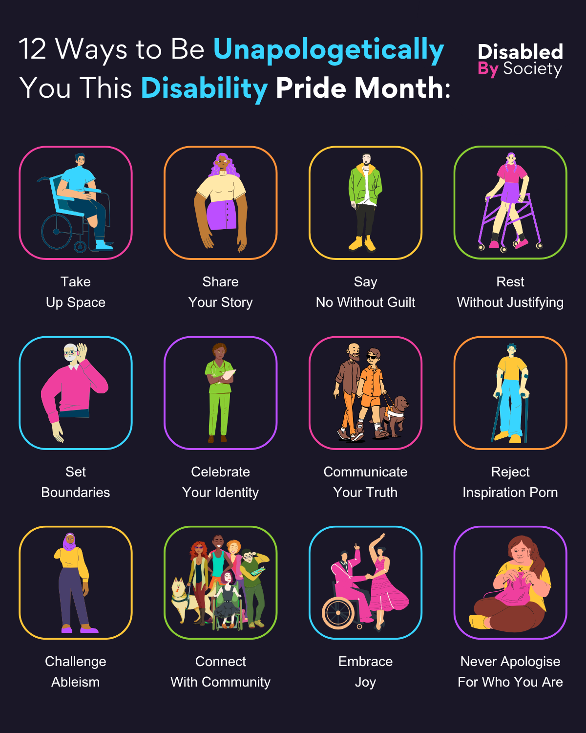 ID: A Disabled by Society graphic titled “12 Ways to Be Unapologetically You This Disability Pride Month.” Below are 12 illustrated examples in colourful boxes showing different ways disabled people can show up with pride and power: Take Up Space – person in a wheelchair confidently posing. Share Your Story – person standing posing, with sight loss. Say No Without Guilt – person standing relaxed, hands in pockets with no apparent Disability. Rest Without Justifying – person using a walker. Set Boundaries – person holding a hand to their ear. Celebrate Your Identity – person holding papers, standing confidently, with no apparent Disability. Communicate Your Truth – two people walking together, one using a guide dog. Reject Inspiration Porn – person using crutches standing firmly. Challenge Ableism – person in a hijab standing, they have upper limb difference. Connect With Community – diverse group of disabled people, including wheelchair users, guide dog, and limb difference. Embrace Joy – two people dancing, one in a wheelchair. Never Apologise For Who You Are – person with down syndrome sitting cross-legged, hand on heart.