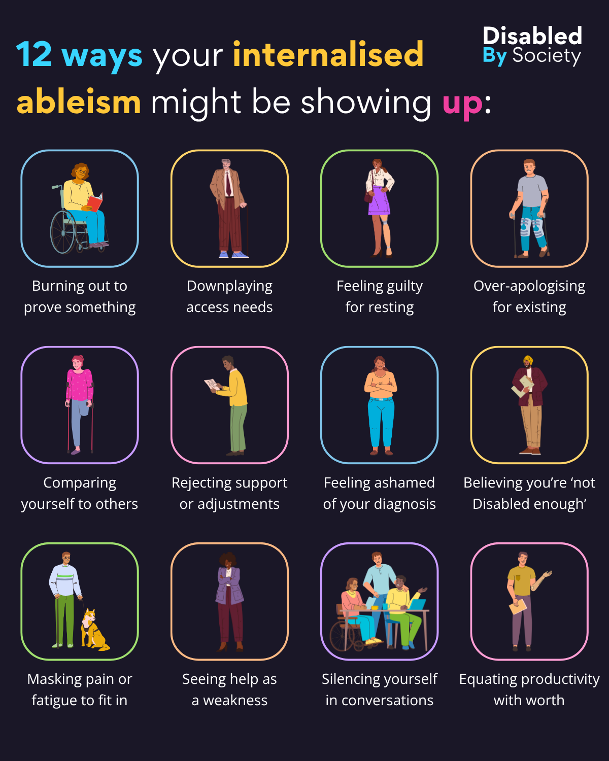 ID: graphic by Disabled by Society titled “12 ways your internalised ableism might be showing up” with the logo in the top right. The image features twelve illustrated boxes, each with a different character and caption. The captions read: Burning out to prove something. Downplaying access needs. Feeling guilty for resting. Over-apologising for existing. Comparing yourself to others. Rejecting support or adjustments. Feeling ashamed of your diagnosis. Believing you’re ‘not Disabled enough’. Masking pain or fatigue to fit in. Seeing help as a weakness. Silencing yourself in conversations. Equating productivity with worth. Each box includes a colourful border and an illustration representing diverse Disabled people representing visible and non-visible Disabilities.