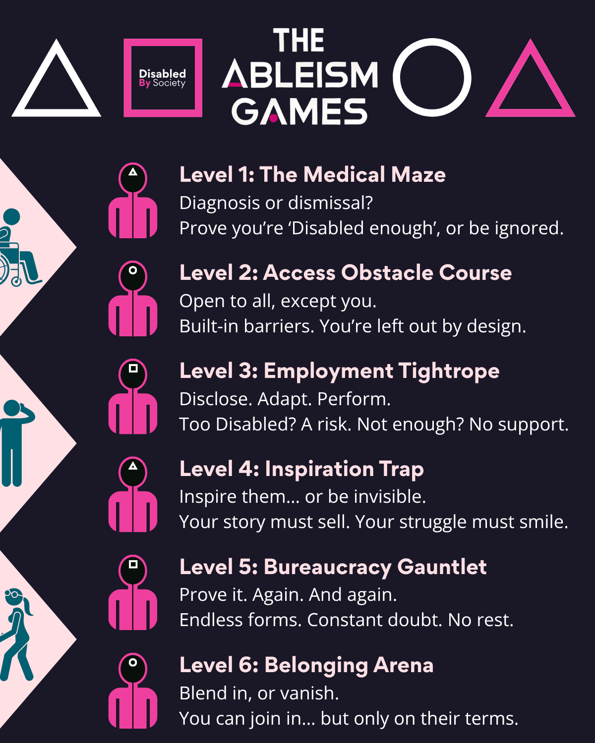 ID: A graphic titled “The Ableism Games” by Disabled by Society, styled like Squid Game. Three shapes (triangle, square, circle) appear above the title. The graphic lists six “levels” Disabled people might navigate, each with a pink icon of a person wearing a hood marked with a game shape, like the tv show! Level 1: The Medical Maze Diagnosis or dismissal? Prove you’re ‘Disabled enough’, or be ignored. Level 2: Access Obstacle Course. Open to all, except you. Built-in barriers. You’re left out by design. Level 3: Employment Tightrope Disclose. Adapt. Perform. Too Disabled? A risk. Not enough? No support. Level 4: Inspiration Trap. Inspire them… or be invisible. Your story must sell. Your struggle must smile. Level 5: Bureaucracy Gauntlet. Prove it. Again. And again. Endless forms. Constant doubt. No rest. Level 6: Belonging Arena. Blend in, or vanish. You can join in… but only on their terms. Decorative icons of Disabled stick figures appear on the left inside a ligh pink diamond shape.