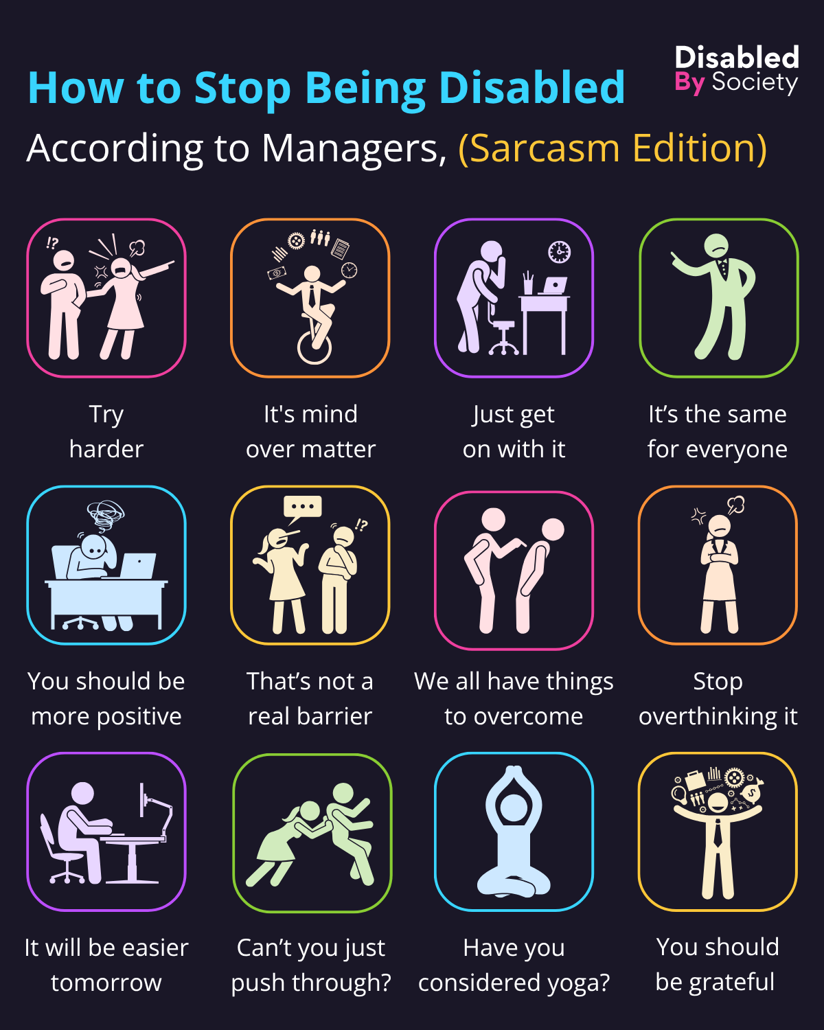 ID: A Disabled by Society graphic titled “How to Stop Being Disabled According to Managers, (Sarcasm Edition)”. The graphic features 12 sarcastic phrases managers often use to dismiss Disabled people’s struggles, each paired with a simplistic icon and a colourful border. The phrases are: Try harder – a manager yelling at someone. It’s mind over matter – person on a unicycle juggling things. Just get on with it – a person stumped at their desk. It’s the same for everyone – a manager pointing and waving a finger. You should be more positive – a person overwhelmed at a computer. That’s not a real barrier – a manger brushing off an employee’s access needs. We all have things to overcome – a manger lecturing someone. Stop overthinking it – an angry manager with their arms crossed. It will be easier tomorrow – a person sitting at a desk as thought the barrier will have magically faded. Can’t you just push through? – a manger pushing a team member. Have you considered yoga? – an employee doing a yoga pose. You should be grateful – a manager surrounded by corporate icons. The tone is sarcastic, critiquing how some of my past managers often minimise real access barriers by offering patronising or unrealistic advice instead of meaningful support.
