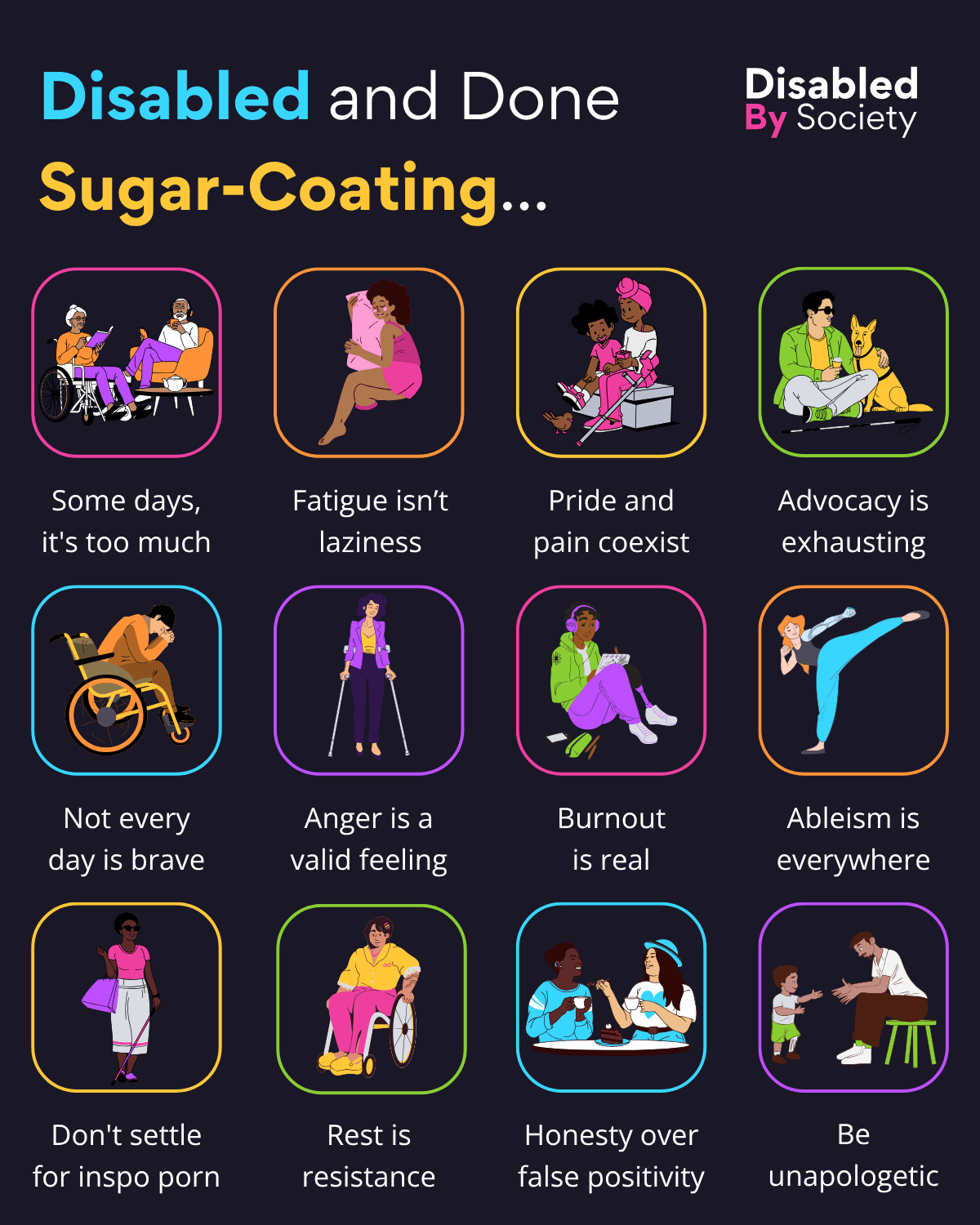 ID: A Disabled By Society graphic titled, “Disabled and Done Sugar-Coating…”. Below 12 icons feature Disabled people with varied identities, access needs, and emotions, each paired with a statement, they read: Some days, it’s too much – Two older Disabled people, one using a wheelchair and the other with a cane, sitting on a sofa reading together. Fatigue isn’t laziness – A person curled up hugging a pillow, wearing a loose pink outfit, resting. Pride and pain coexist – A mother with their child, they are sat down as the mother’s mobility aid rests beside them. Advocacy is exhausting – A person sitting cross-legged wearing sunglasses, leaning against a yellow assistance dog. Not every day is brave – A person slumped in a wheelchair, looking visibly drained and overwhelmed. Anger is a valid feeling – A person using crutches walking to calm down. Burnout is real – A person with sat on the ground with noise cancelling headphones on. Ableism is everywhere – A person mid-kick in blue athletic wear, strike a fighting pose! Don’t settle for inspo porn – A person with a white cane as they walk away rejecting inspo porn. Rest is resistance – A person in a wheelchair wearing comfy clothes resting without guilt. Honesty over false positivity – Two friends sat together communicating, one with a hearing aid on. The other person has down syndrome. The two are having areal convo together. Be unapologetic – A parent sat with arms open as their young child using a prosthetic walks towards them.